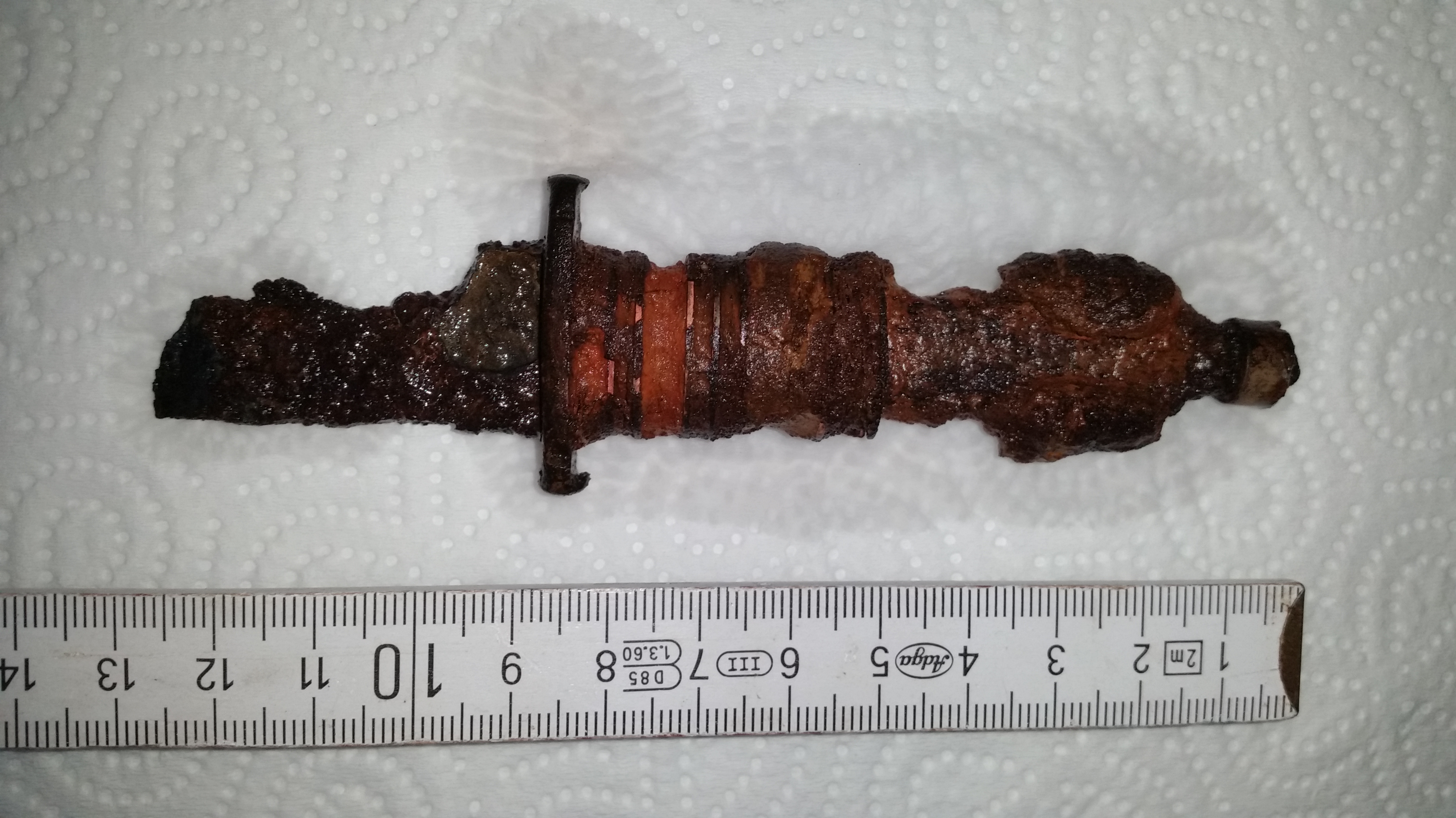Hab heute morgen dieses Messerfragment im Wald gefunden. Der Griff ist relativ aufwendig gearbeitet. Holz oder Leder und dazwischen sind Scheiben aus Kupfer oder Messing. Ich hätte gerne gewusst wie alt es sein könnte. Danke!