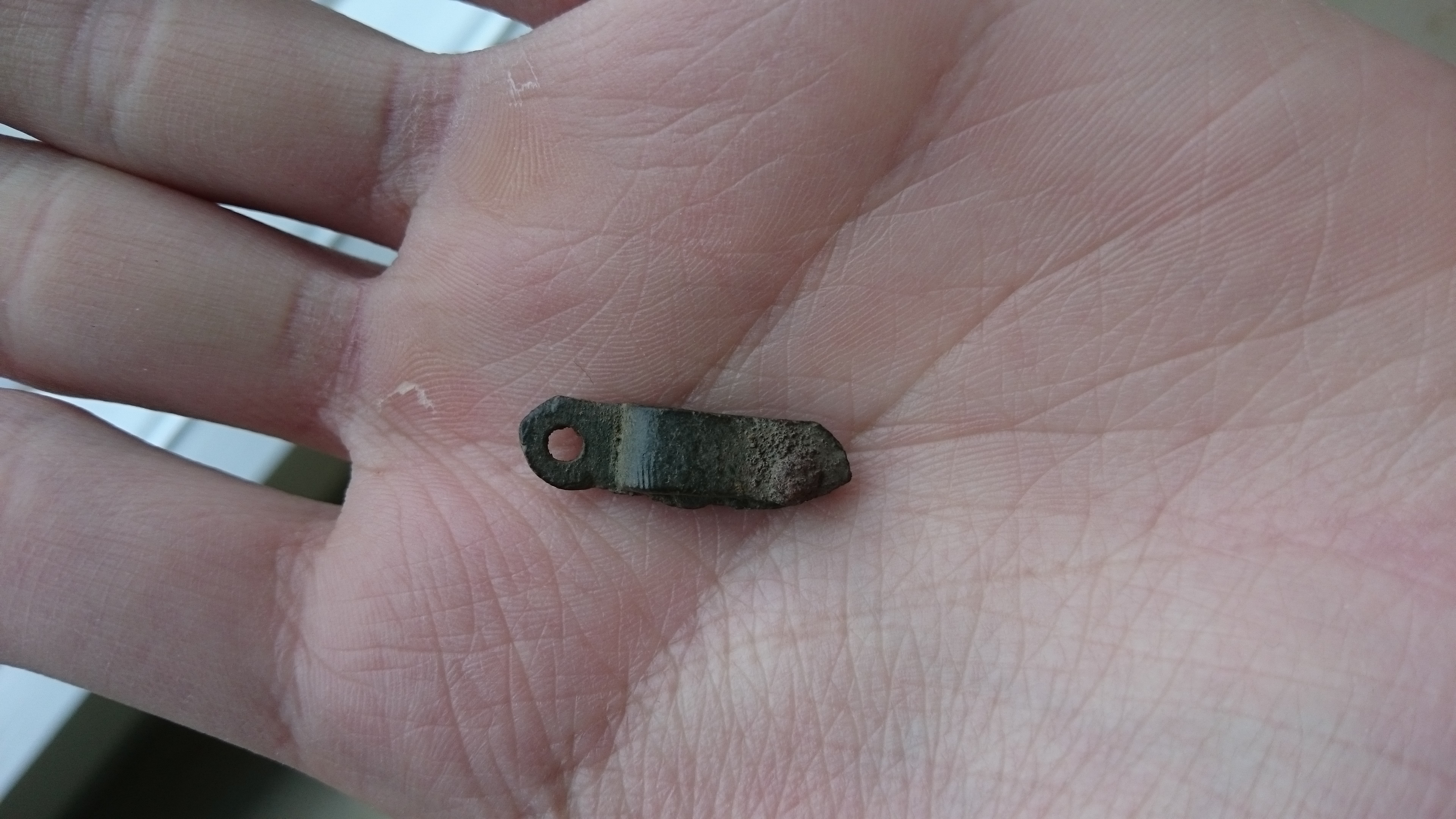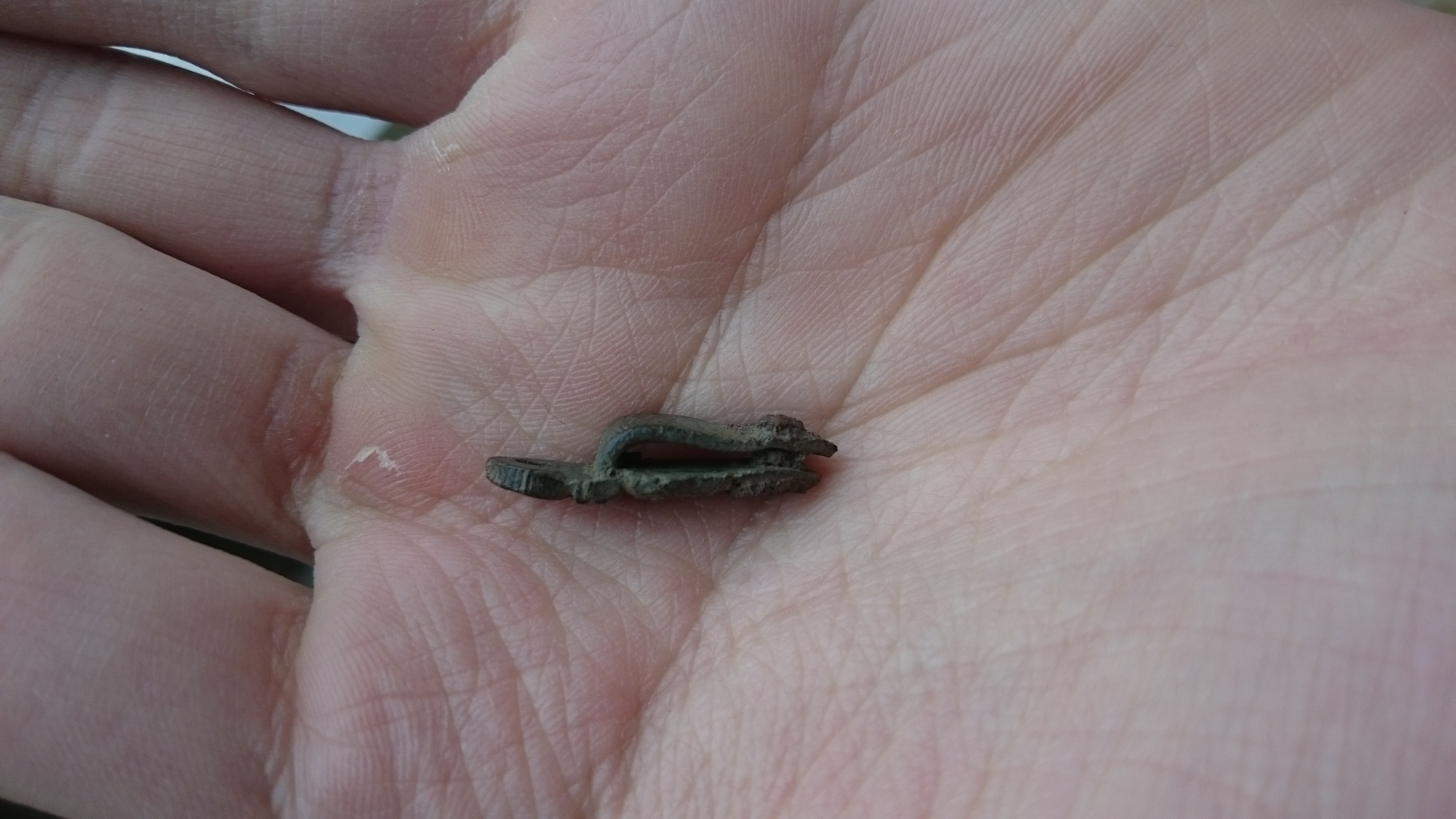 Ich hab letztens dieses kleine Ding auf dem Acker gefunden. Was denkt ihr, was es ist und wie alt es ist? Als Vorschlag hatte ich schon Buchschließe 17/18 Jhd. und Bandelier Abschluss 14. Jhd.