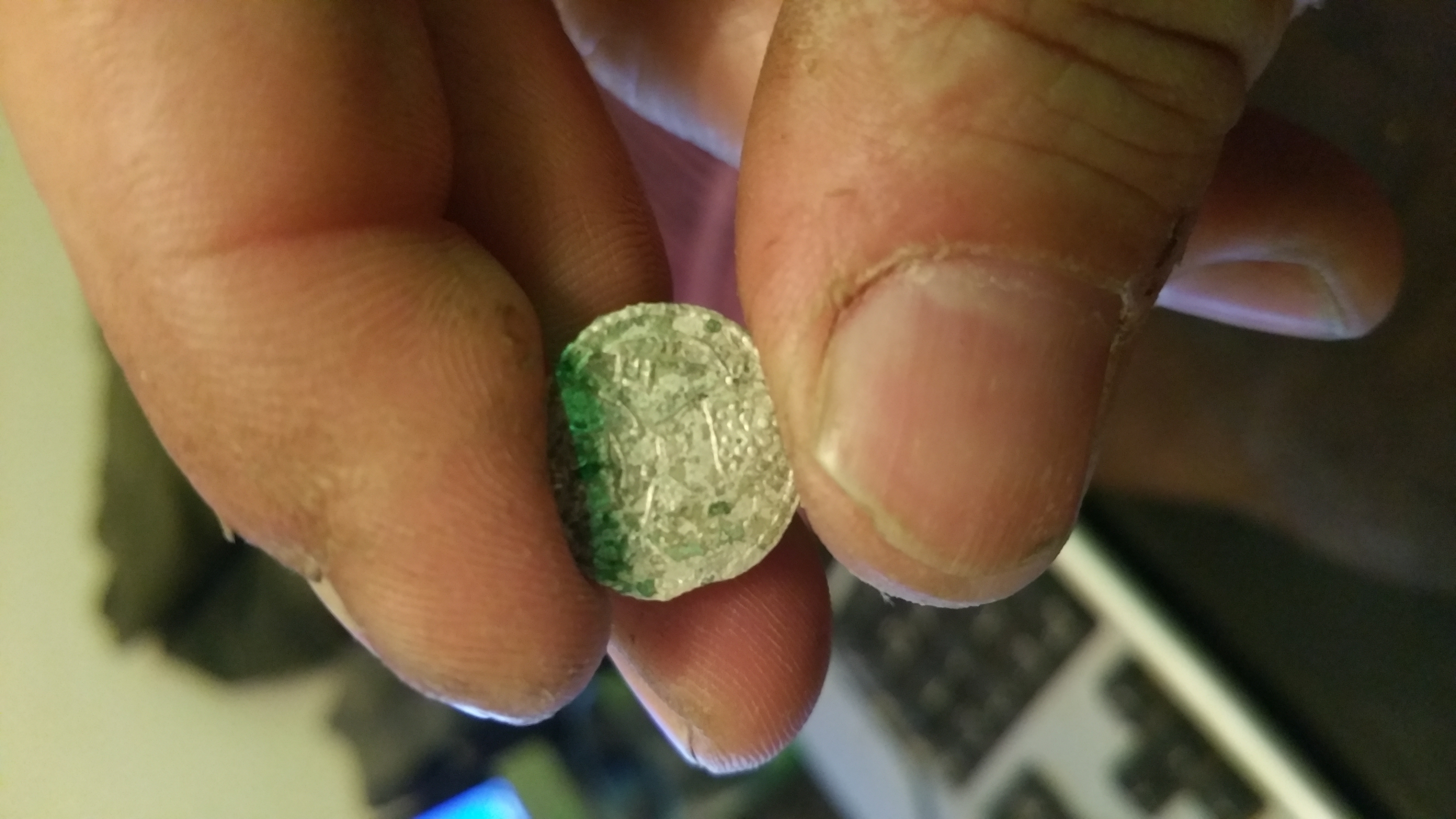 Könnte eine Münze sein, ist sehr dünn und klein.