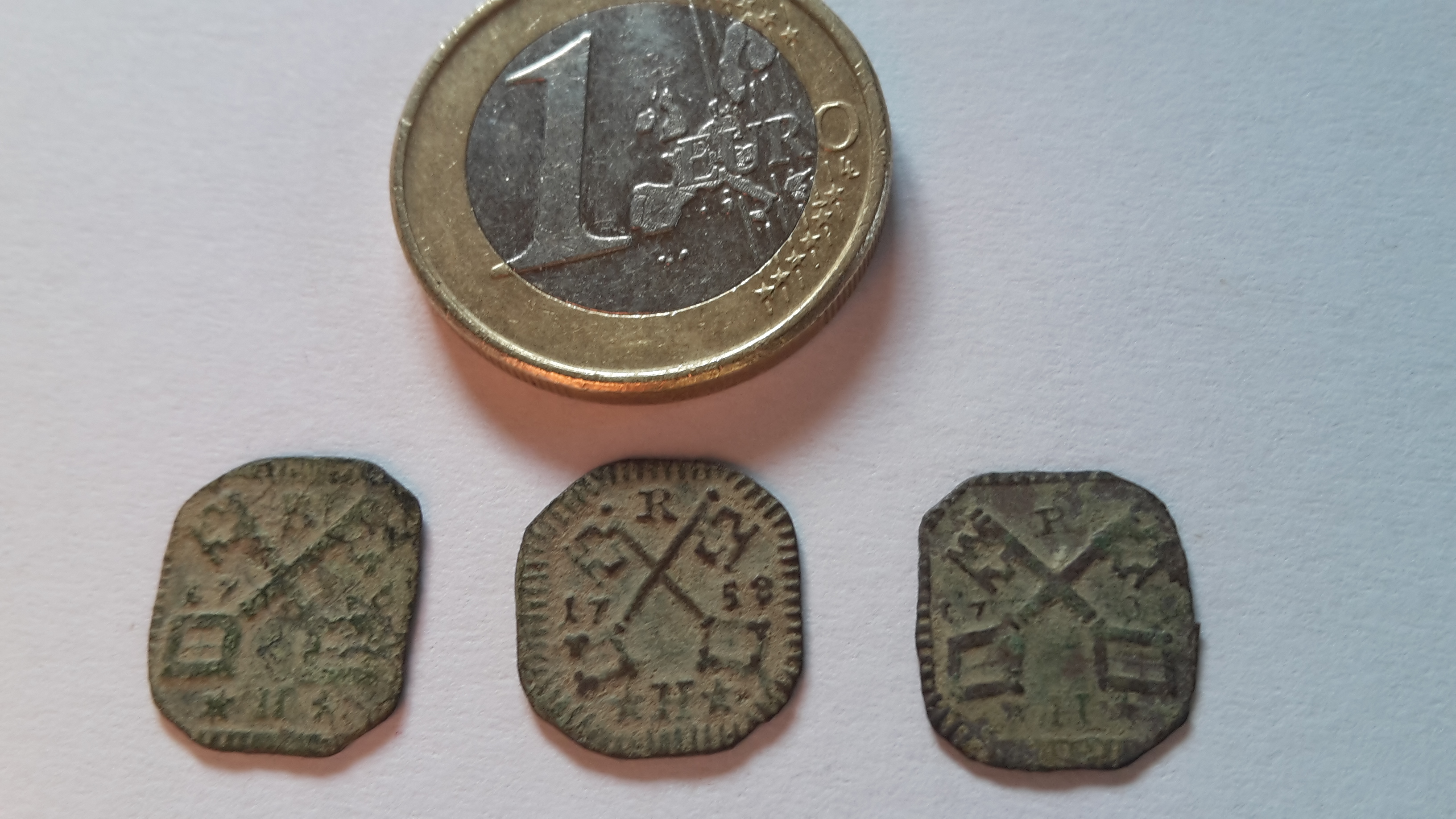 Habe diese 3 wie ich sie nenne "Plättchen" zwischen unzähligen Gewehr bzw Musketenkugeln gefunden. Auf einem ist das Jahr 1758 zu erkennen. Es sind zwei gekreuzte Schlüssel und oben ein R und unten ein H. Die Rückseite ist glatt und nicht beschriftet. Das sie sehr klein sind frage ich mich wo die mal dran waren oder ob sie was gekennzeichnet haben. Kann jemand was dazu sagen...?