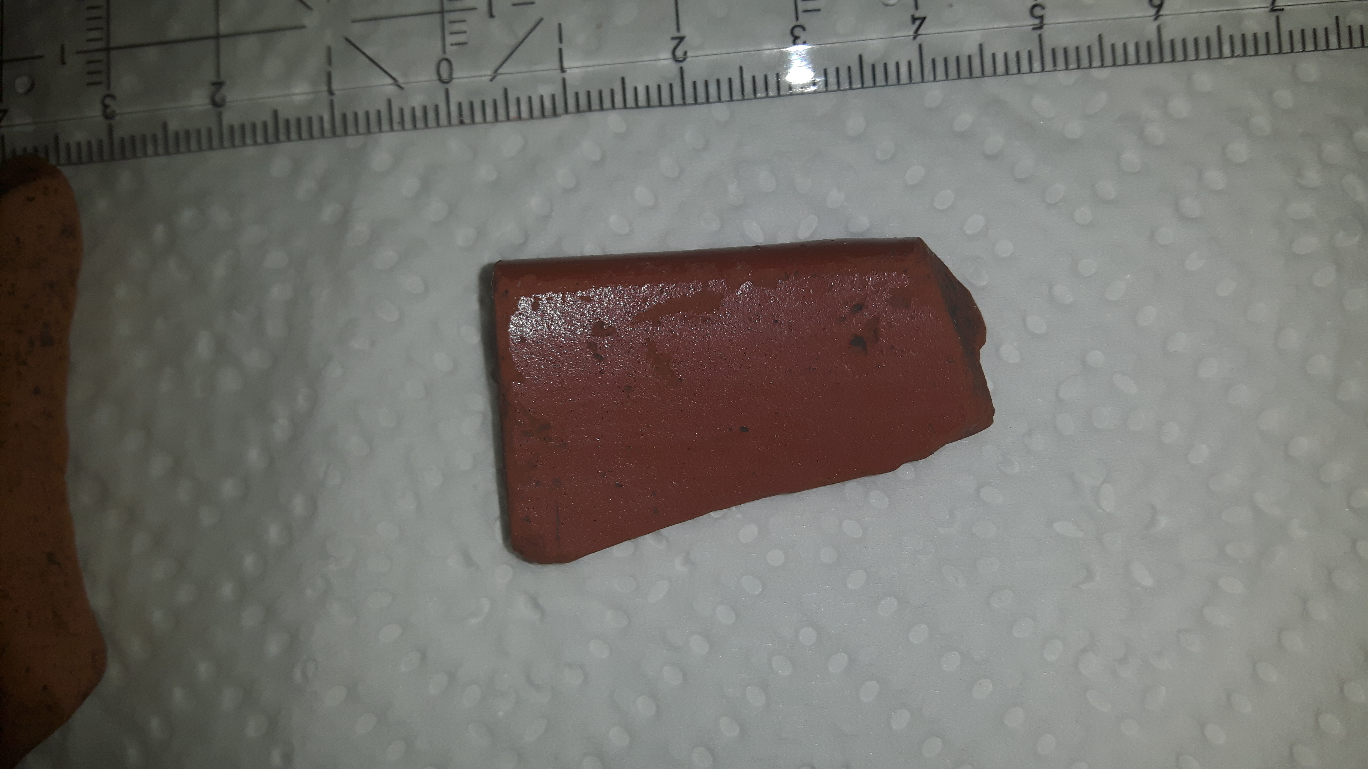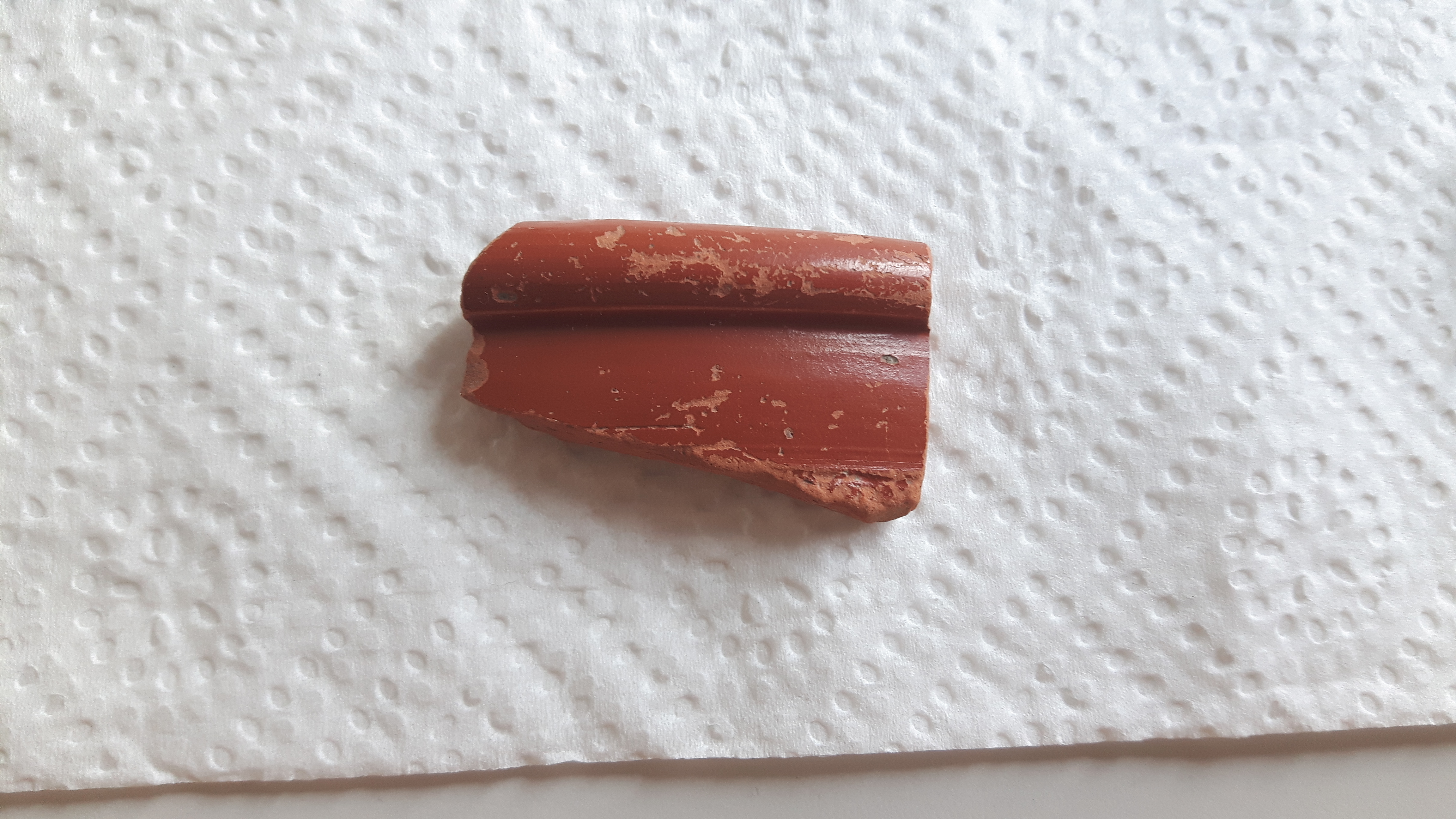 Die "rote Keramik" ist nach Autopsie der Bilder eventuell ein Randscherbe Terra Siggilata (Dragendorff 29 oder 37). Der Glanz spricht für südgallische Produktion als dann vermutlich Drag. 29 und in die gleiche Zeit zu datieren wie das Fibelfragment. Die Scherbe mit der grünen Glasur ist mittelalterlich oder neuzeitlich, der Rest nicht zu erkennen.