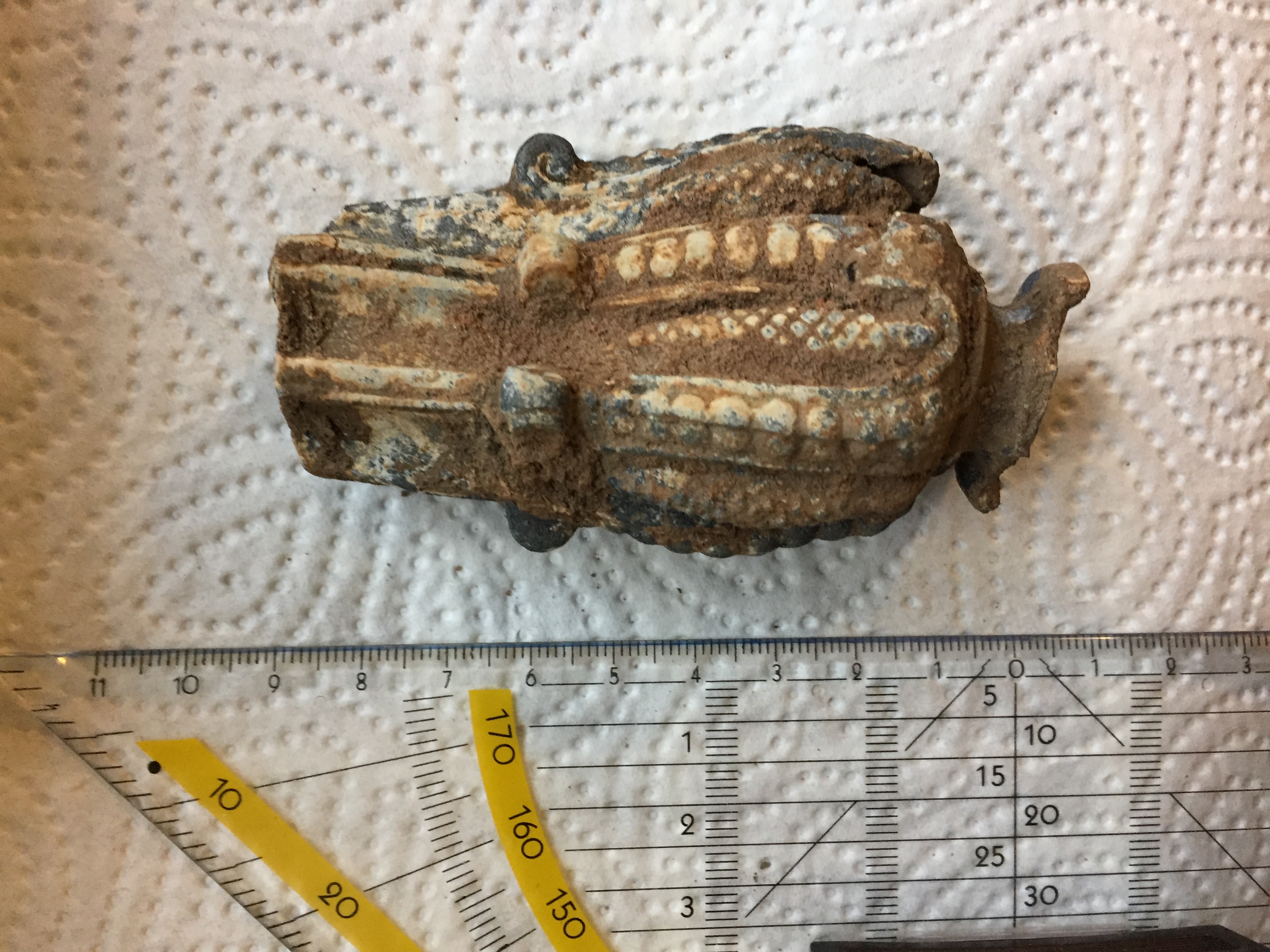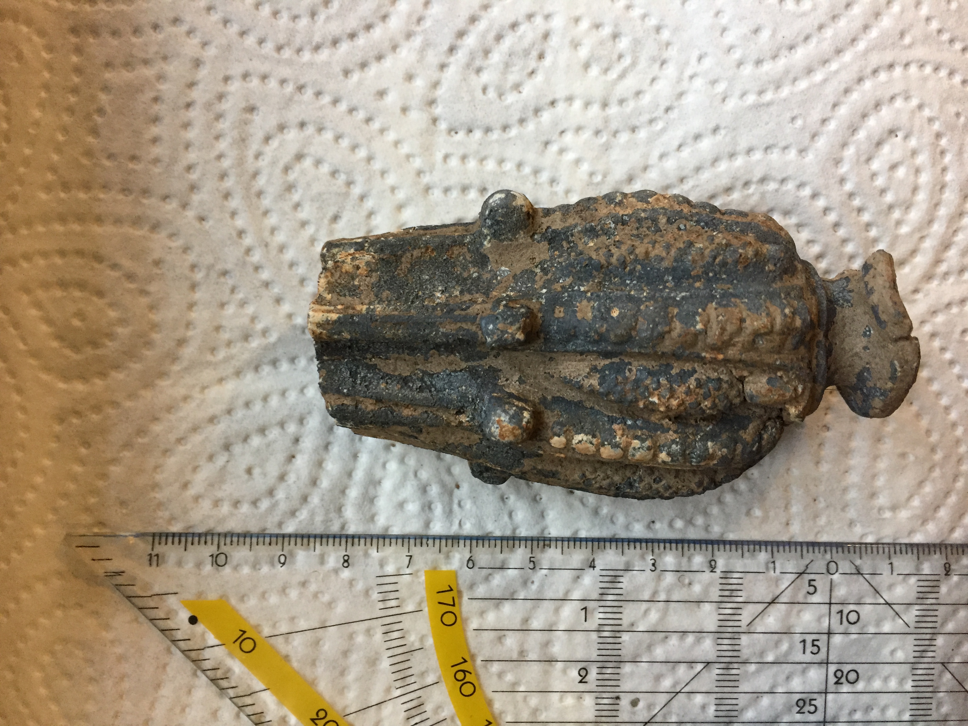 Das Objekt ist unten und oben offen. Die Verzierungen scheinen eine Frucht zu sein. Eventuell Getreide.