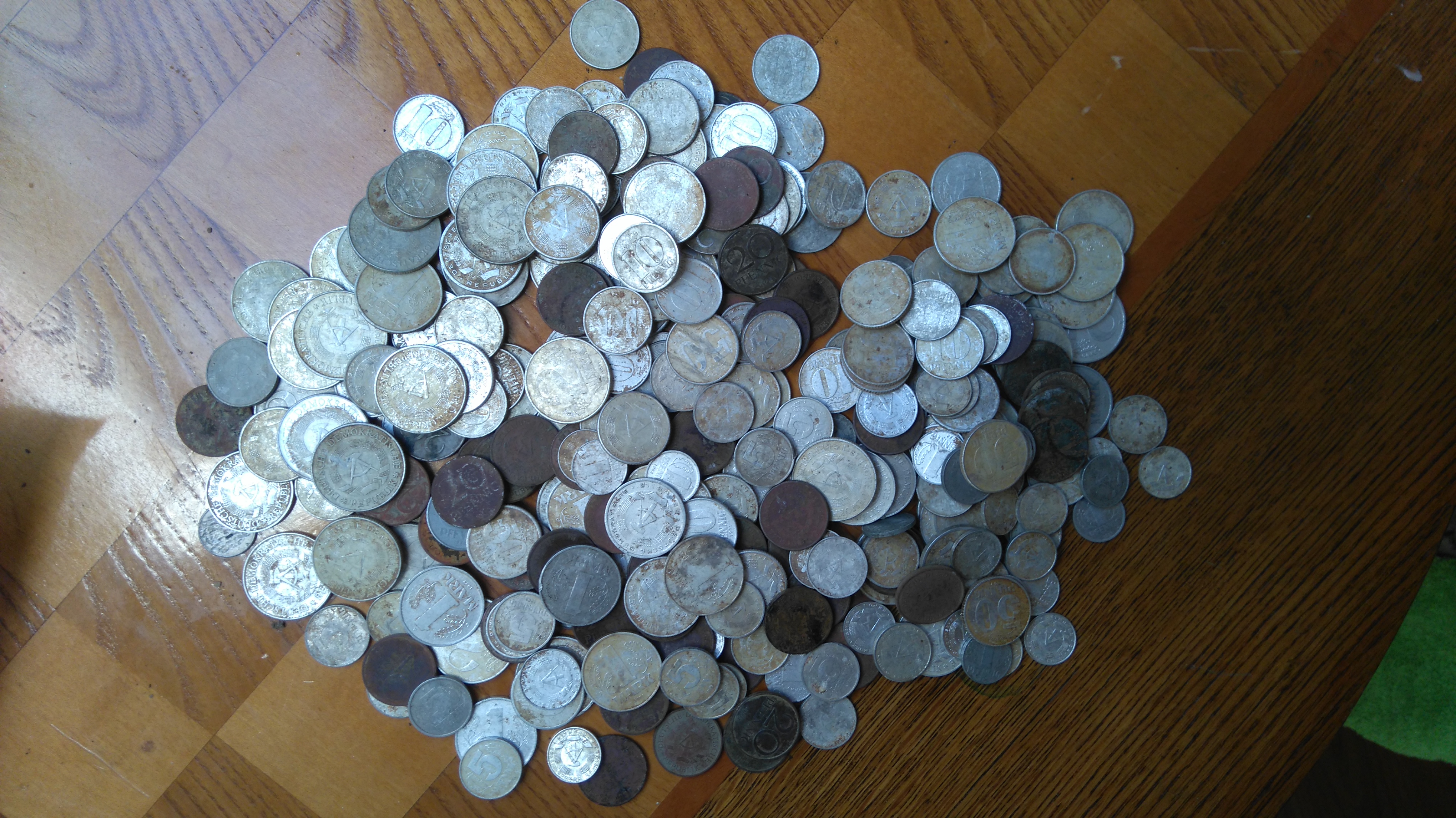 Auf den Bildern nicht zu sehen , da mir im Freundeskreis doch ab und zu was abgeluchst wird: 3 5 Markstücke DDR, 1 Fünfmarkstück , Eine Mark BRD, Ein grossel Jesuskreuz versilbert, ein Viertel Doller 1964 Silber, Ein pfund GB , 3 polnische Münzen.