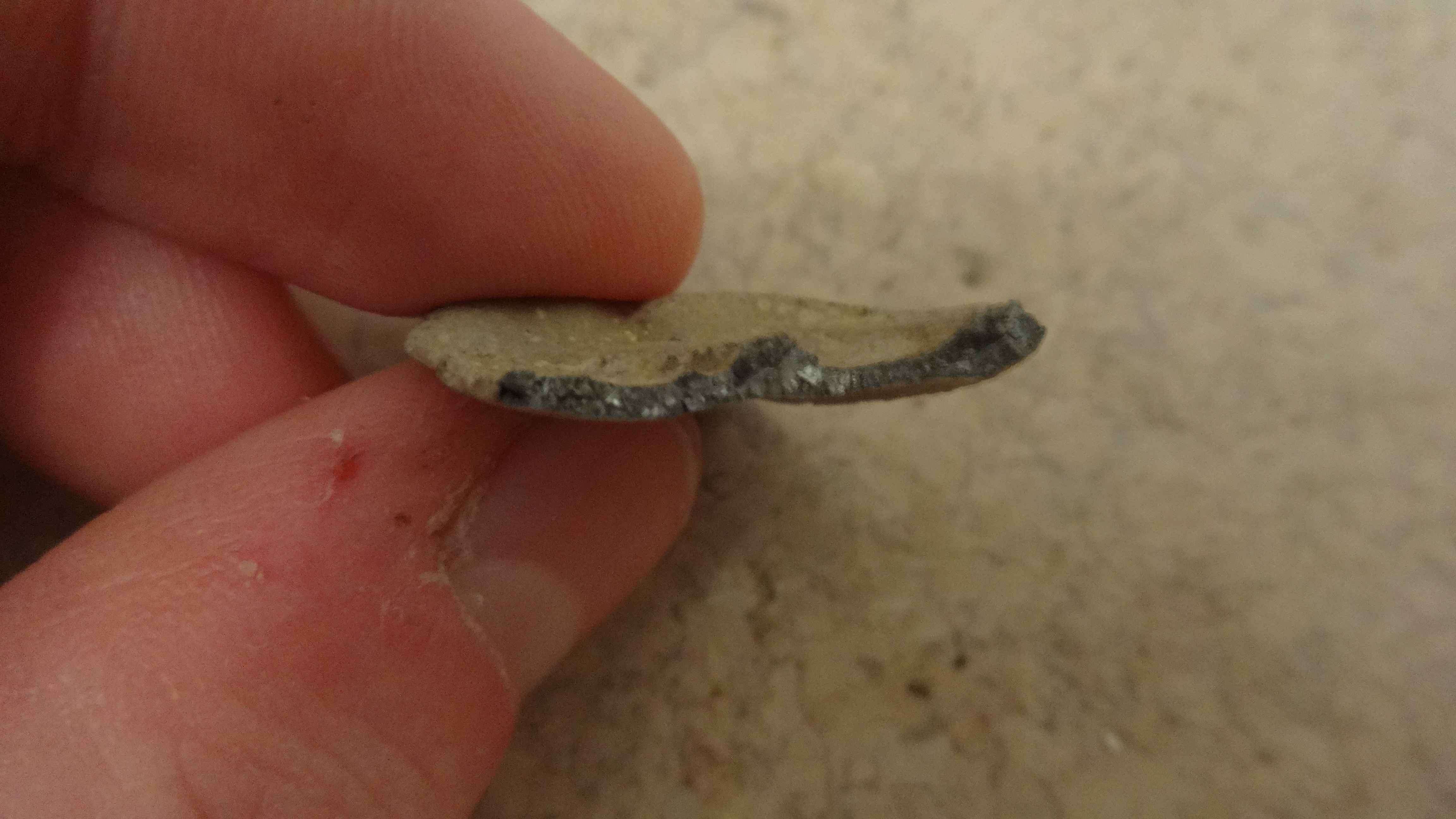 Die Rückseite fühlt sich irgendwie "weich" und glatt an, Matall kann ich leider nicht benennen. An einer Bruchstelle glänzt es etwas.