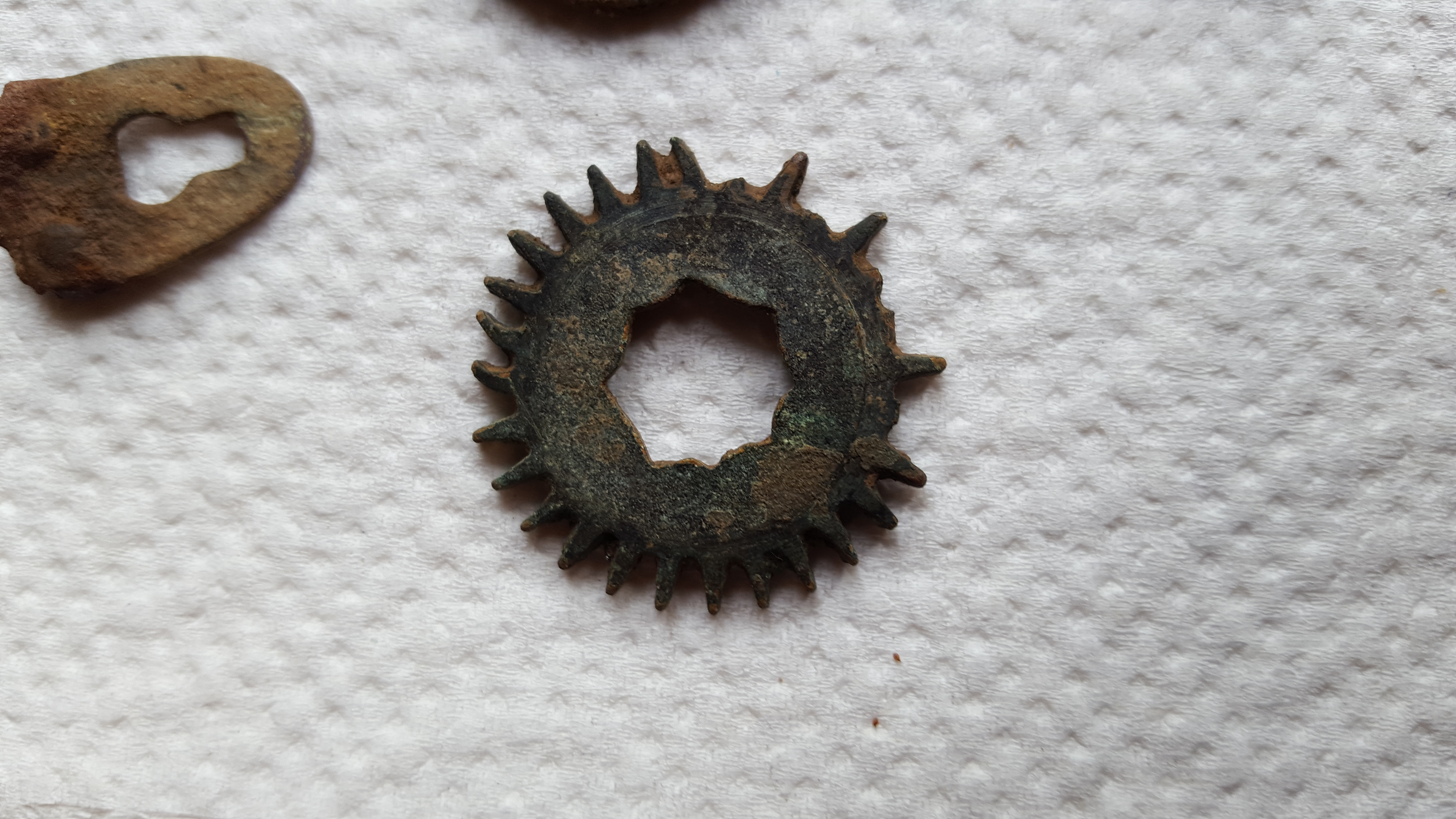 War gestern wieder mal 2 Stunden unterwegs und fand zwischen vielen anderen Dingen das hier. Denke es könnte ein Zahnrad sein, aber dazu ist es zu fein. Vielleicht ein Sporenrädchen? Vielleicht weiß jemand etwas darüber?