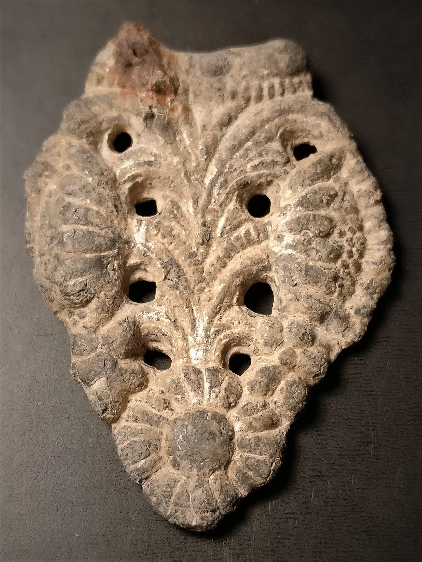 Ich denke, dass der verrostete Rest auf der oberen linken Ecke einmal eine Befestigung war, wonach ich auf eine bäuerliche florale Brosche tippe?