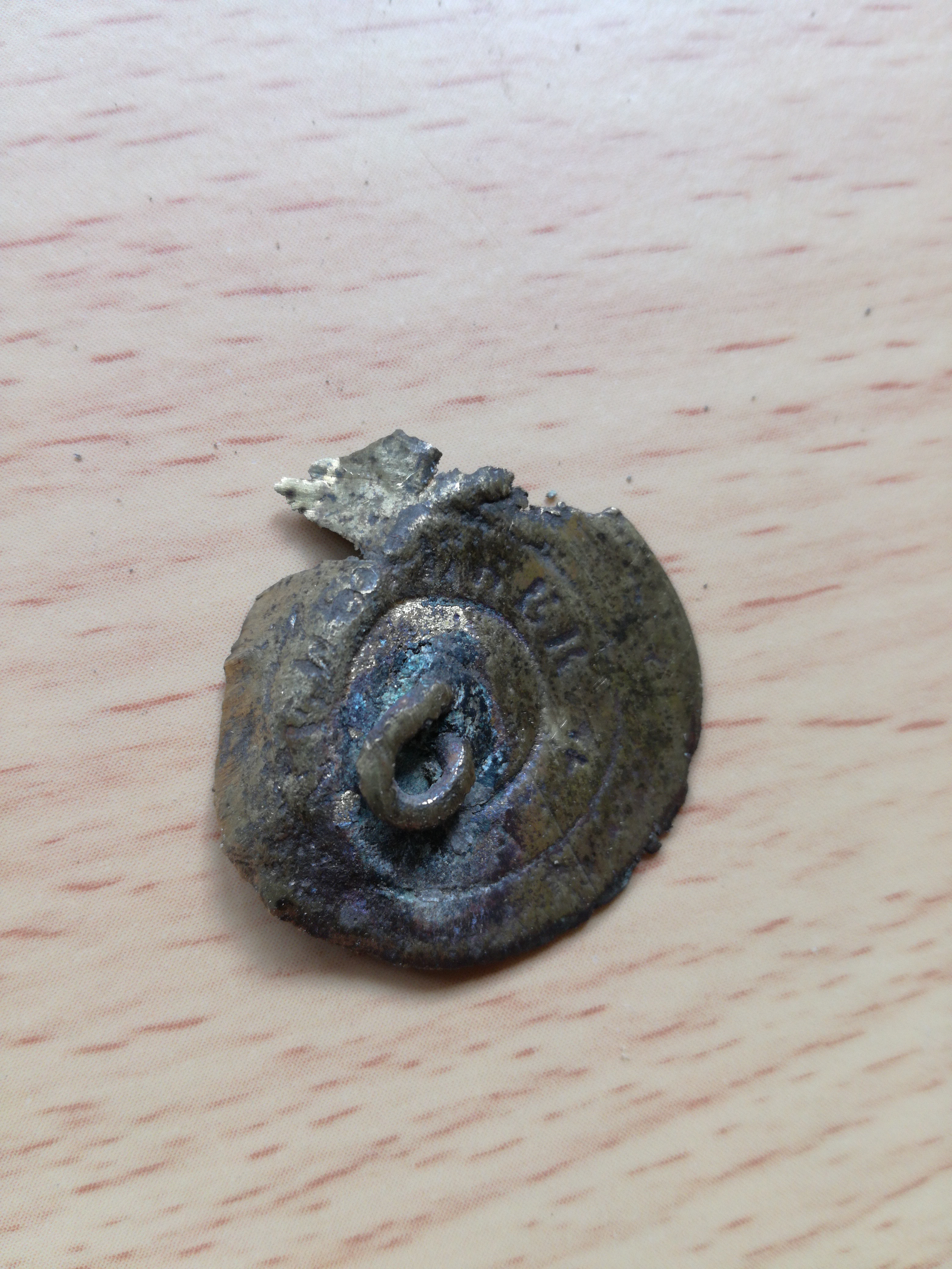 Ich habe diesen Knopf gefunden. Er ist sehr dünn und wahrscheinlich aus Kupfer. Von unten ist er vergoldet und besitzt eine Inschrift, die ich nicht entziffern kann.
