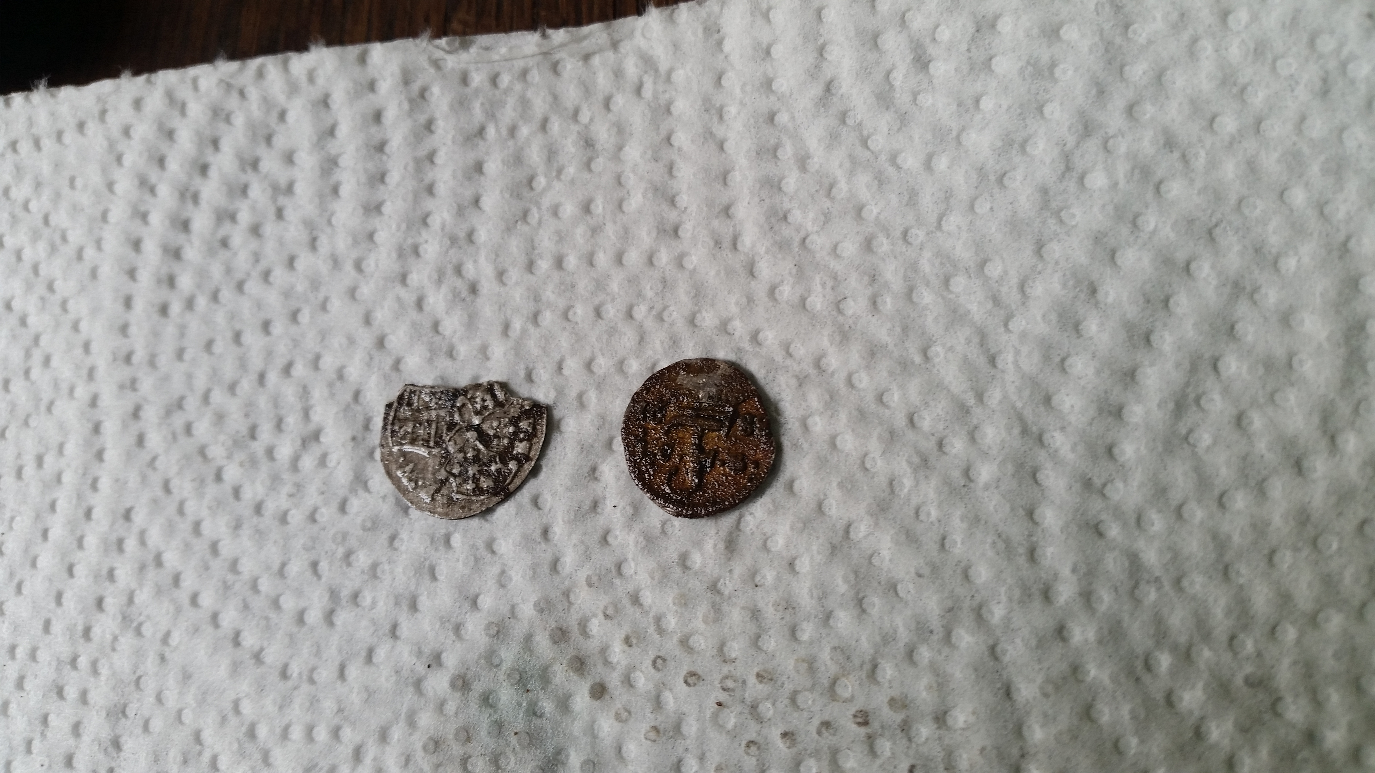 Die vollständig erhaltene Münze stammt aus Walkenried, Friedrich I. von Sachsen-Gotha-Altenburg, ein 3er aus dem Jahre 1688 und die andere, zerbrochene Münze auch ein 3er aus dieser Zeit (1689).