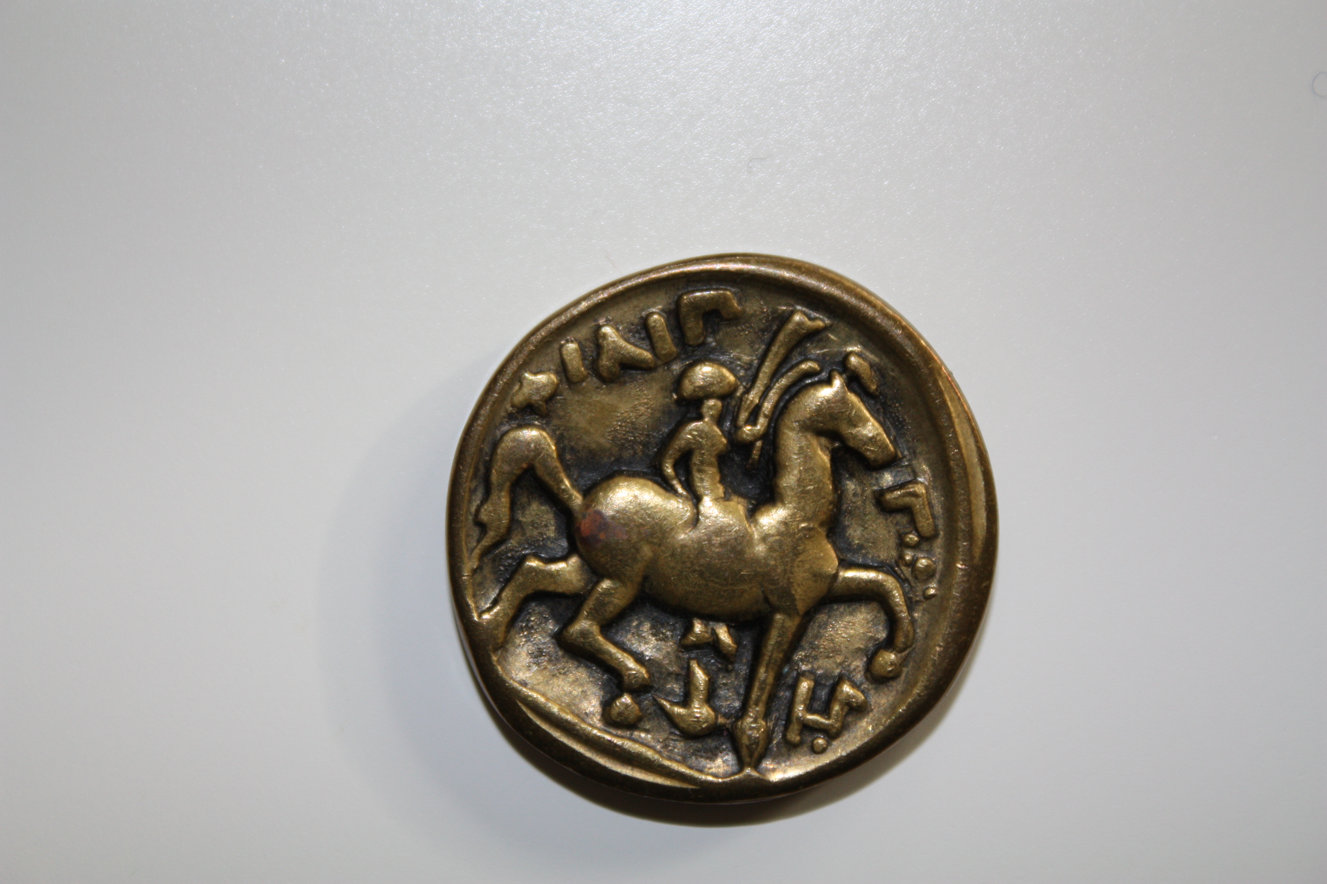 Es ist eine Fälschung. Eine Seite ist die einer makedonischen Münze zur Zeit von Phillip II nachempfunden, die andere Seite unbekannt. Die Numismatikforen sind voll davon. Sorry.