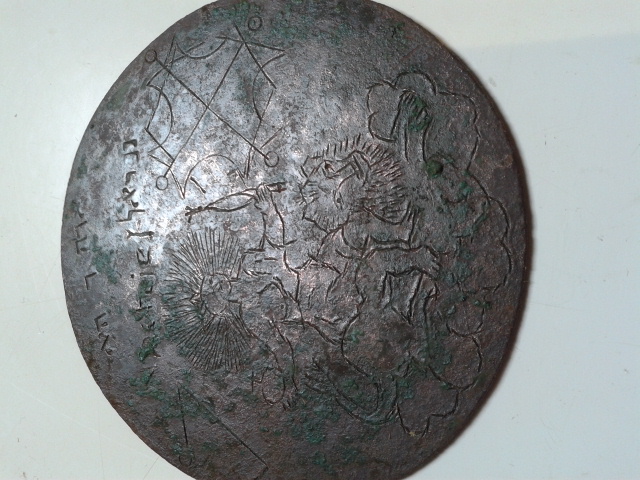 eine alte Mühle die ab 19Jh. nicht mehr verzeichnet ist, aber auf einer Karte von 1650, stattete ich einen Besuch ab. Gefunden habe ich diese Kupferscheibe 85mm x 1,5mm. Auf der einen Seite eingestanzt das Motiv sitzender Mann auf einem Löwen. Hat dazu jemand eine Ahnung was das darstellt?