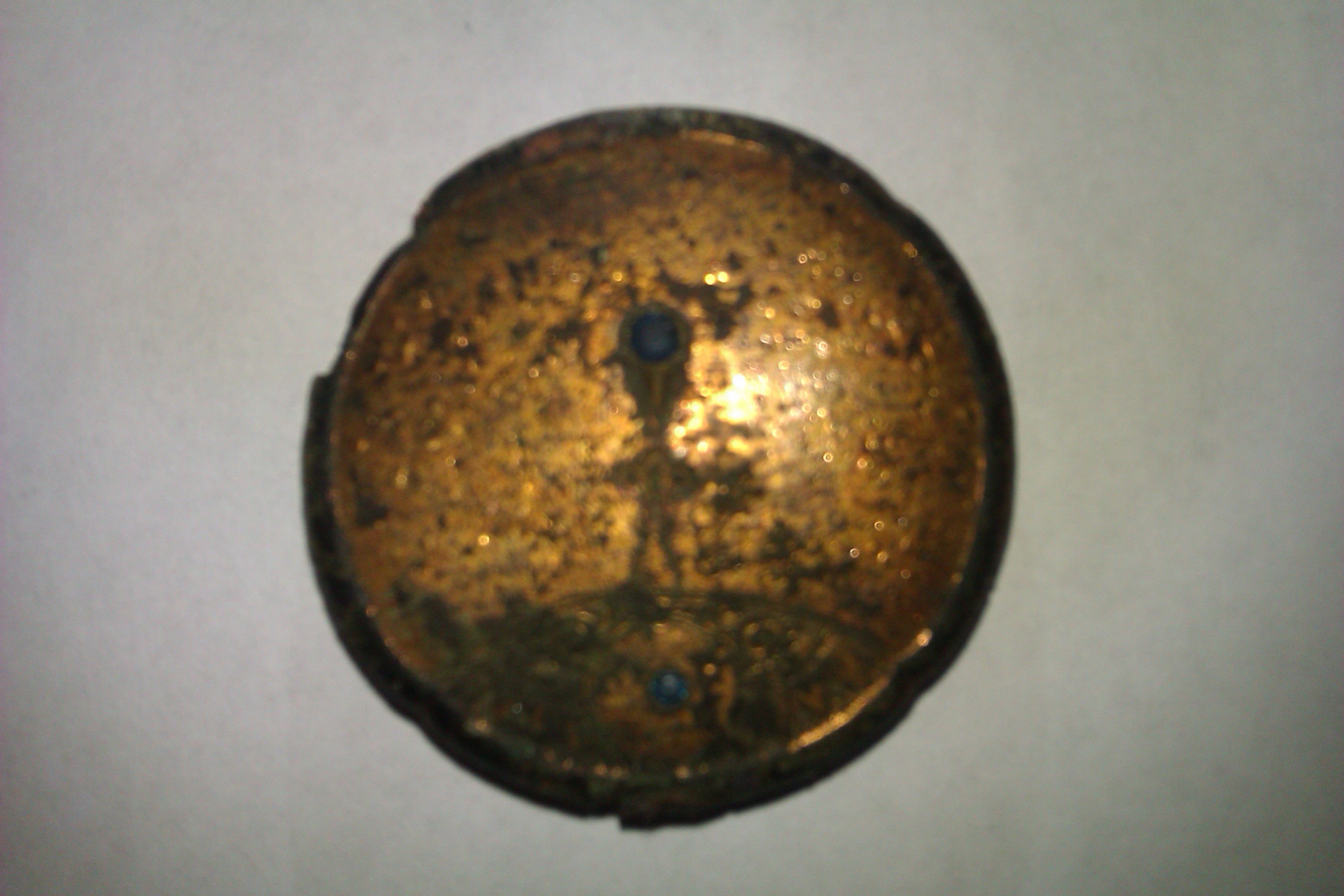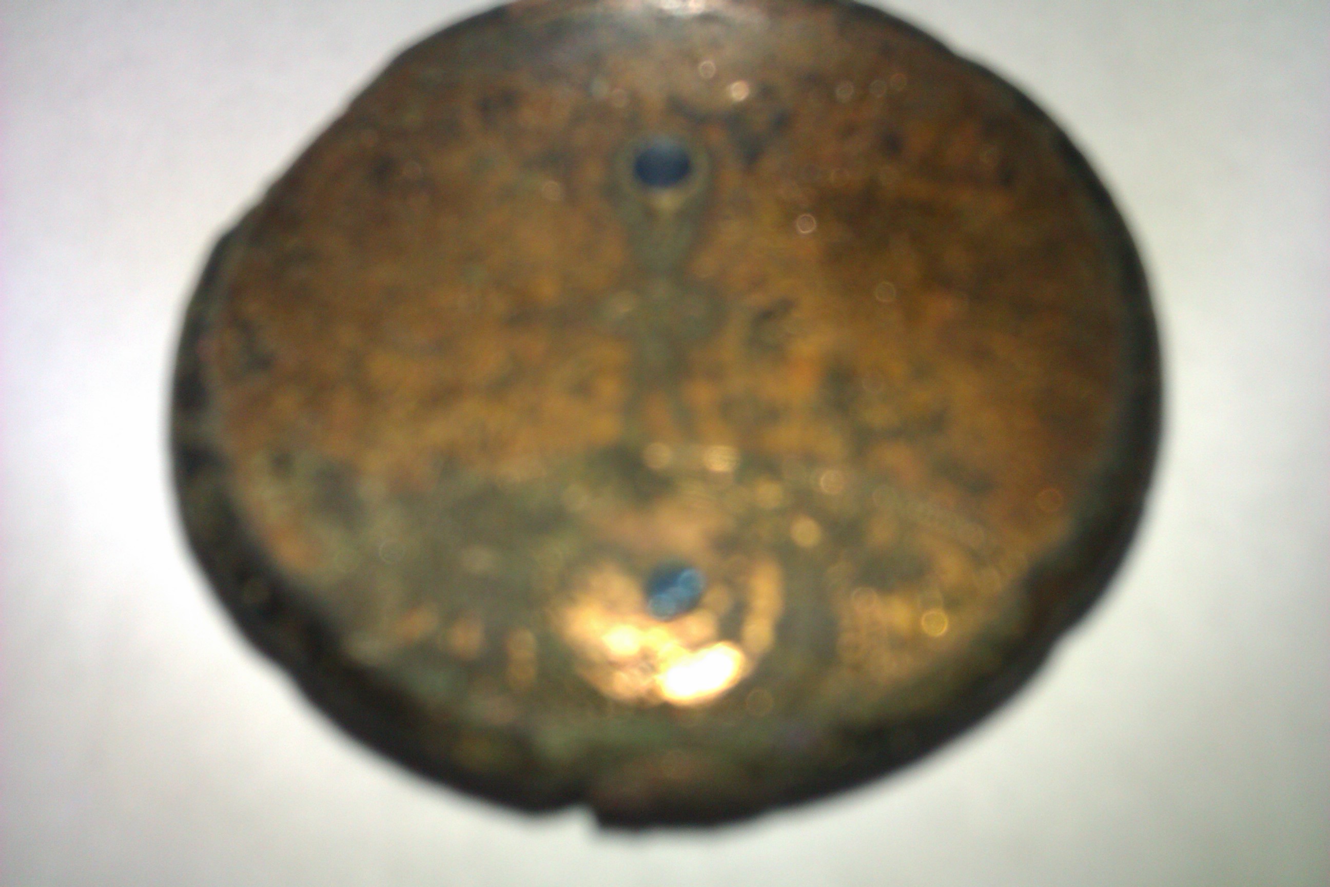 Erst dachte ich nach euren Aussagen an eine Brosche und die zwei schwarzen Punkte evtl die Besetigungspunkte einer Nadel o.Ä.