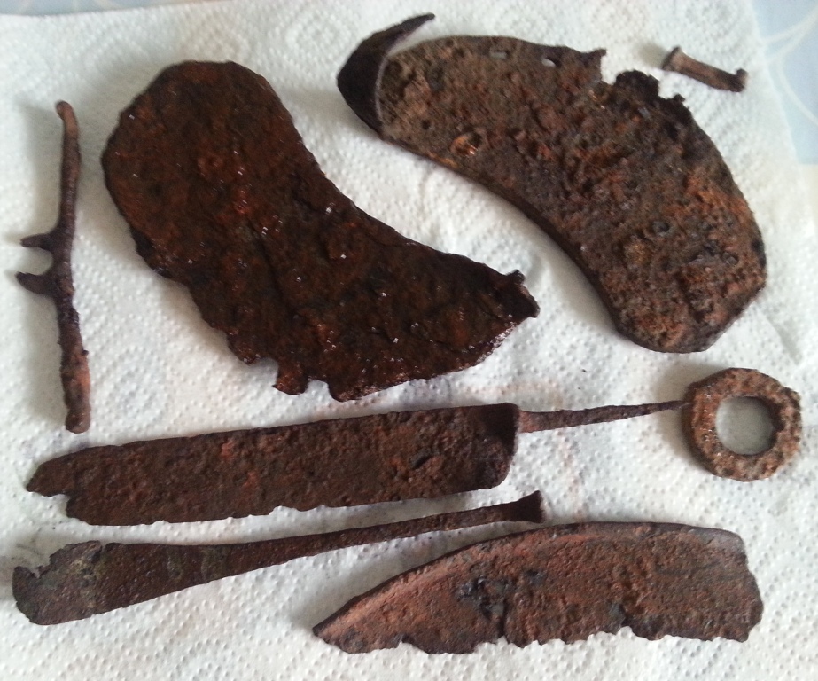 hier meine Funde von gestern 2 Ochseneisen, ein teil einer Sense, 1 Hufnagel, 1 Messer, ein Gabelteil, 1 Unterlagsscheibe
