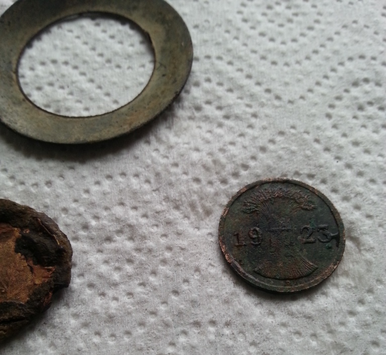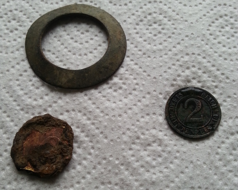 2 Rentenpfennigstück, eine Zehnerle, 1 rundes etwas ? und eine Unterlegscheibe.