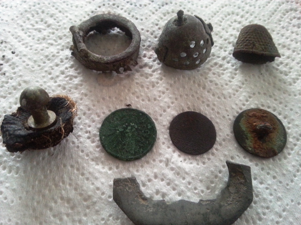 1 Schnallenstück, 1 Scheibenknopf, 1 Knopf mit Leder? 1 Fingerhut und ein Pfeifendeckel mit Halterung.