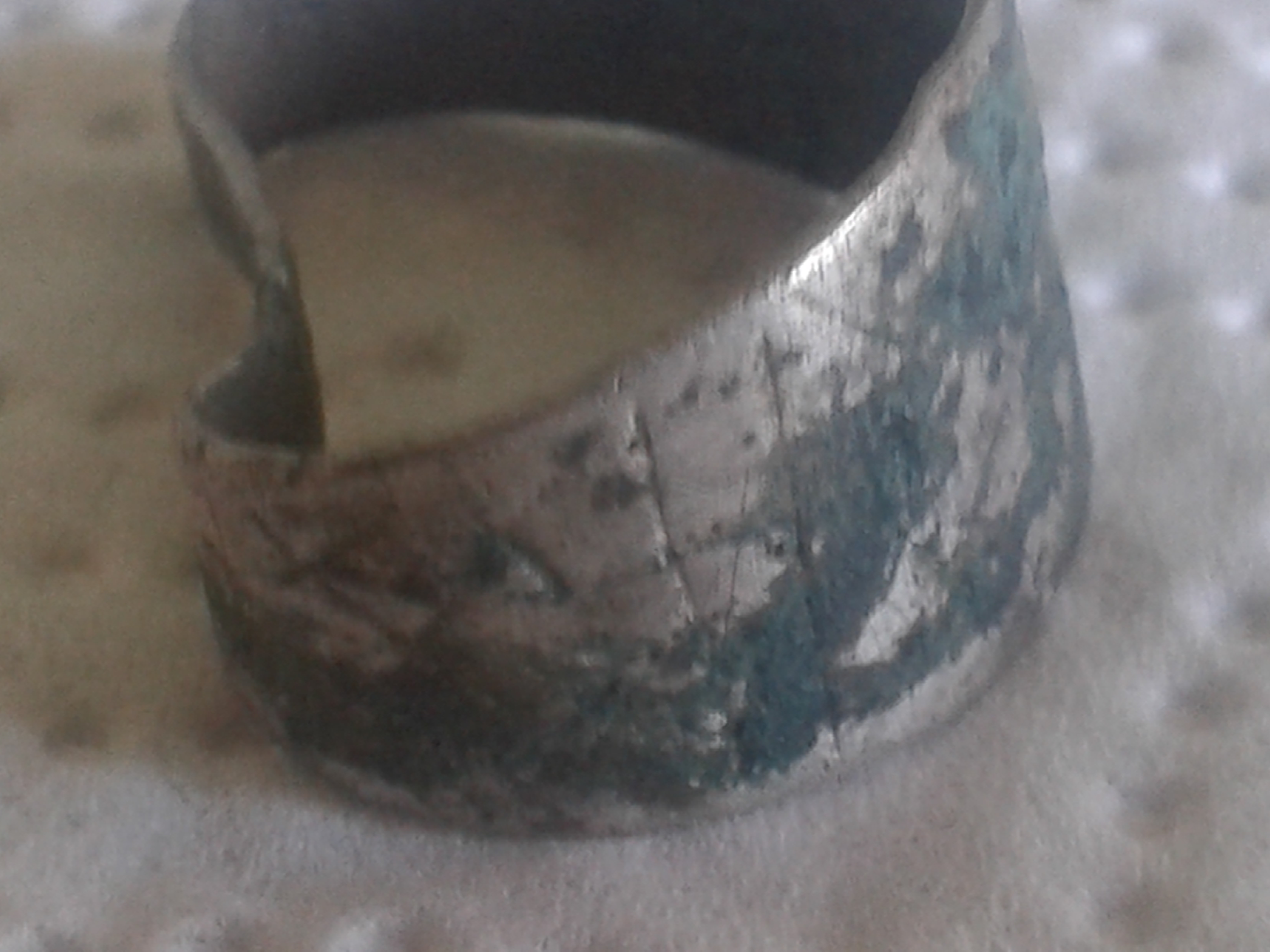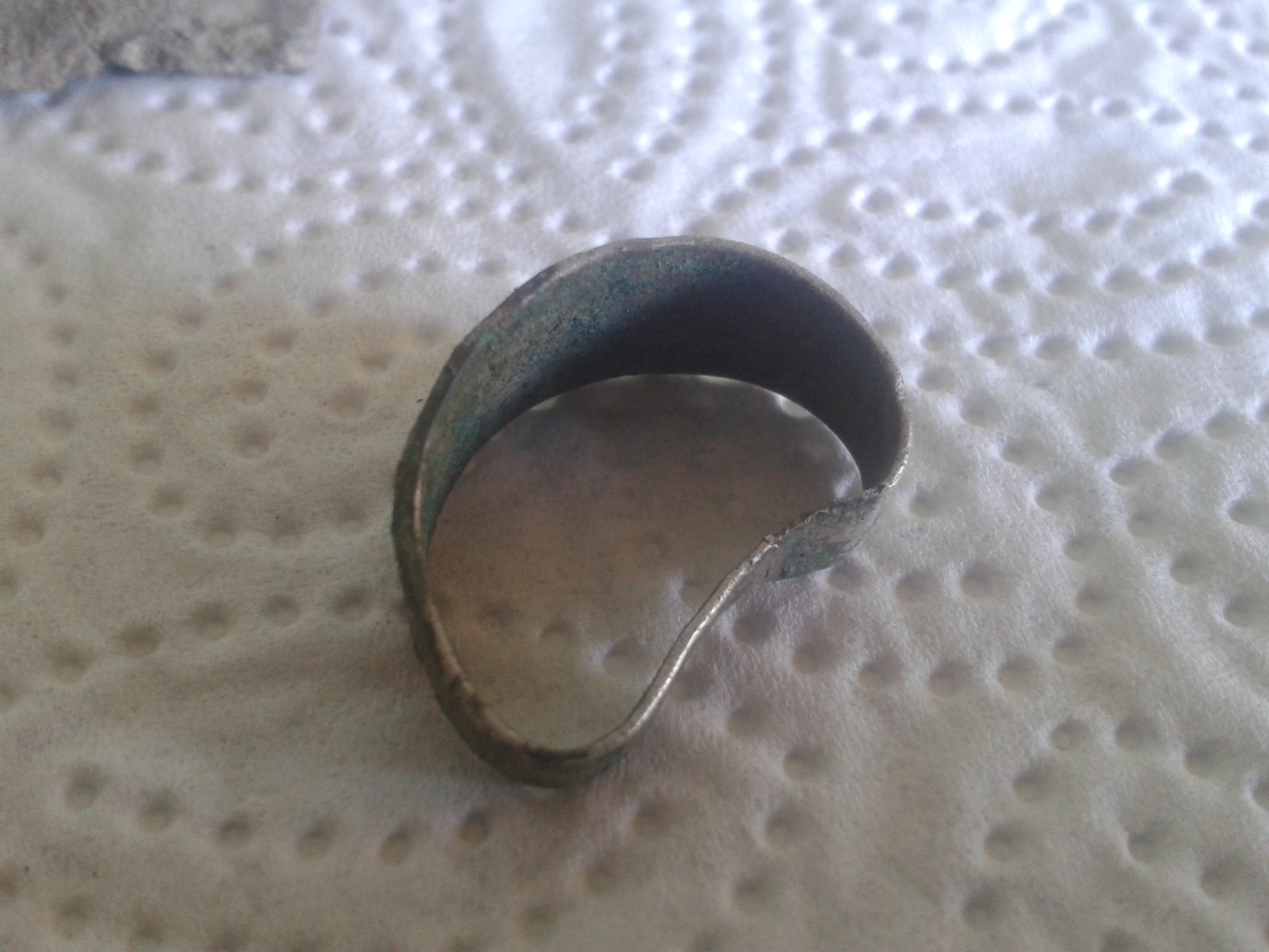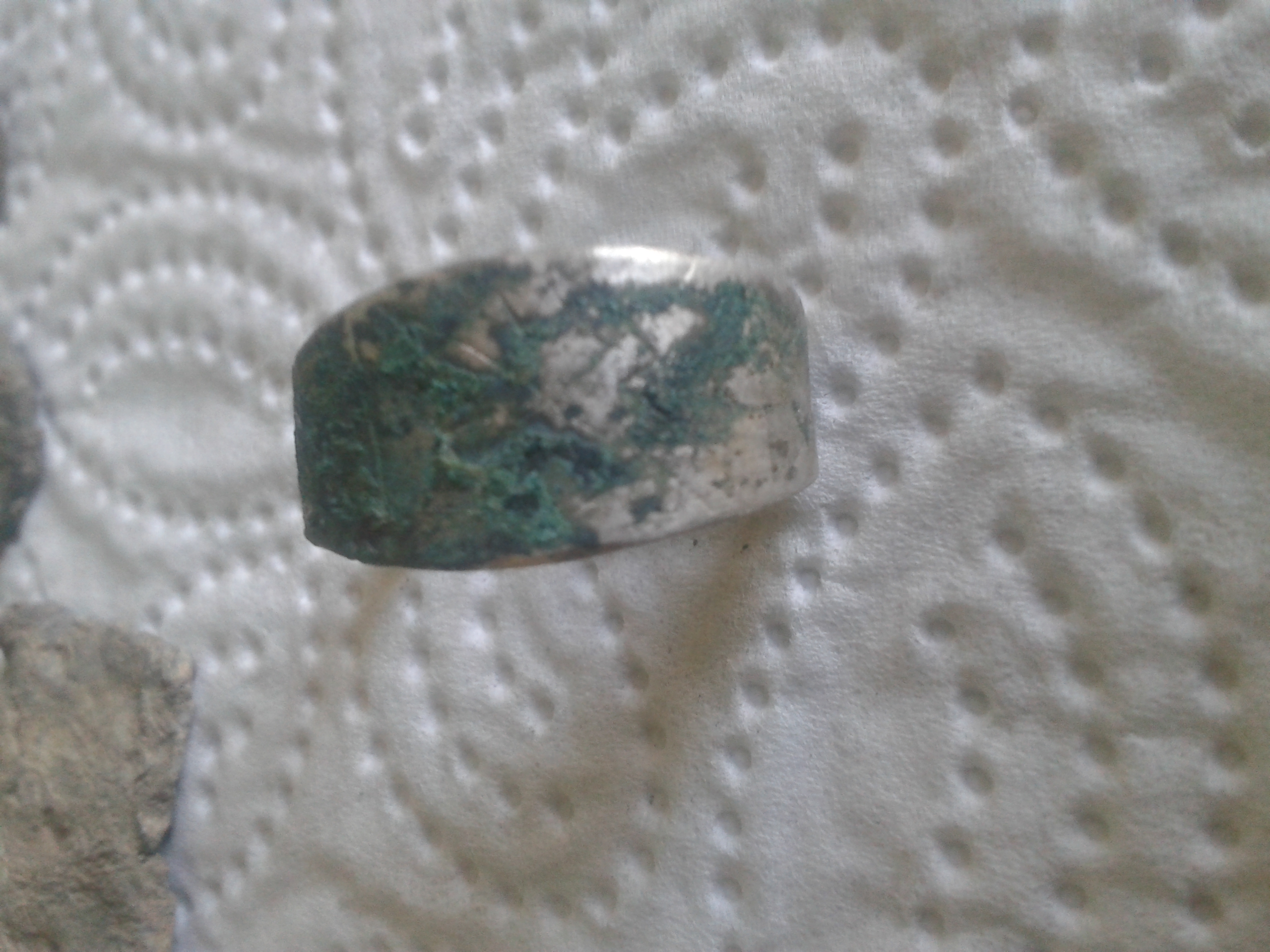 Der Ring dürfte Silber sein und wahrscheinlich auch ein paar Tage älter, zu erkennen sind eigenartige Zeichen, da wo dieses grüne Zeugs nicht drauf ist.