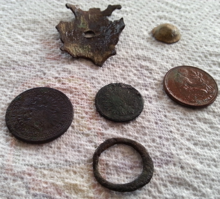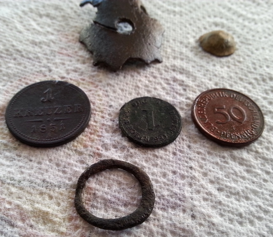hatte heute etwas Glück, der Pfennig hat mir noch gefehlt den Kreuzer habe ich schon, der ist aber besser erhalten. Ein Bronce Ring war zum 1. mal auch dabei und ein gutes altes 50 Pfennig Stück,