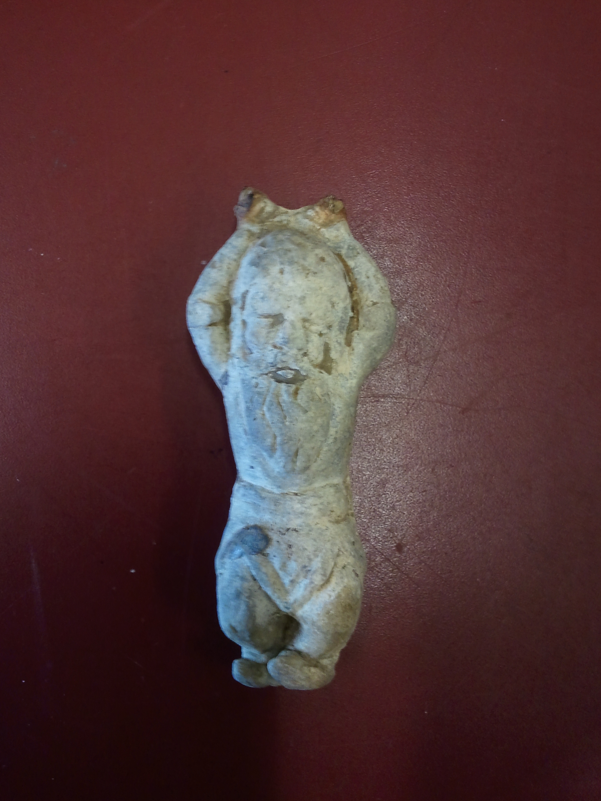 Es ist recht schwer...131gramm. Die Hände überm Kopf scheinen irgendwo dran gewesen zu sein, sieht abgebrochen aus. Ein Ring vielleicht? Die Füsse sind evtl ein wenig verbogen.