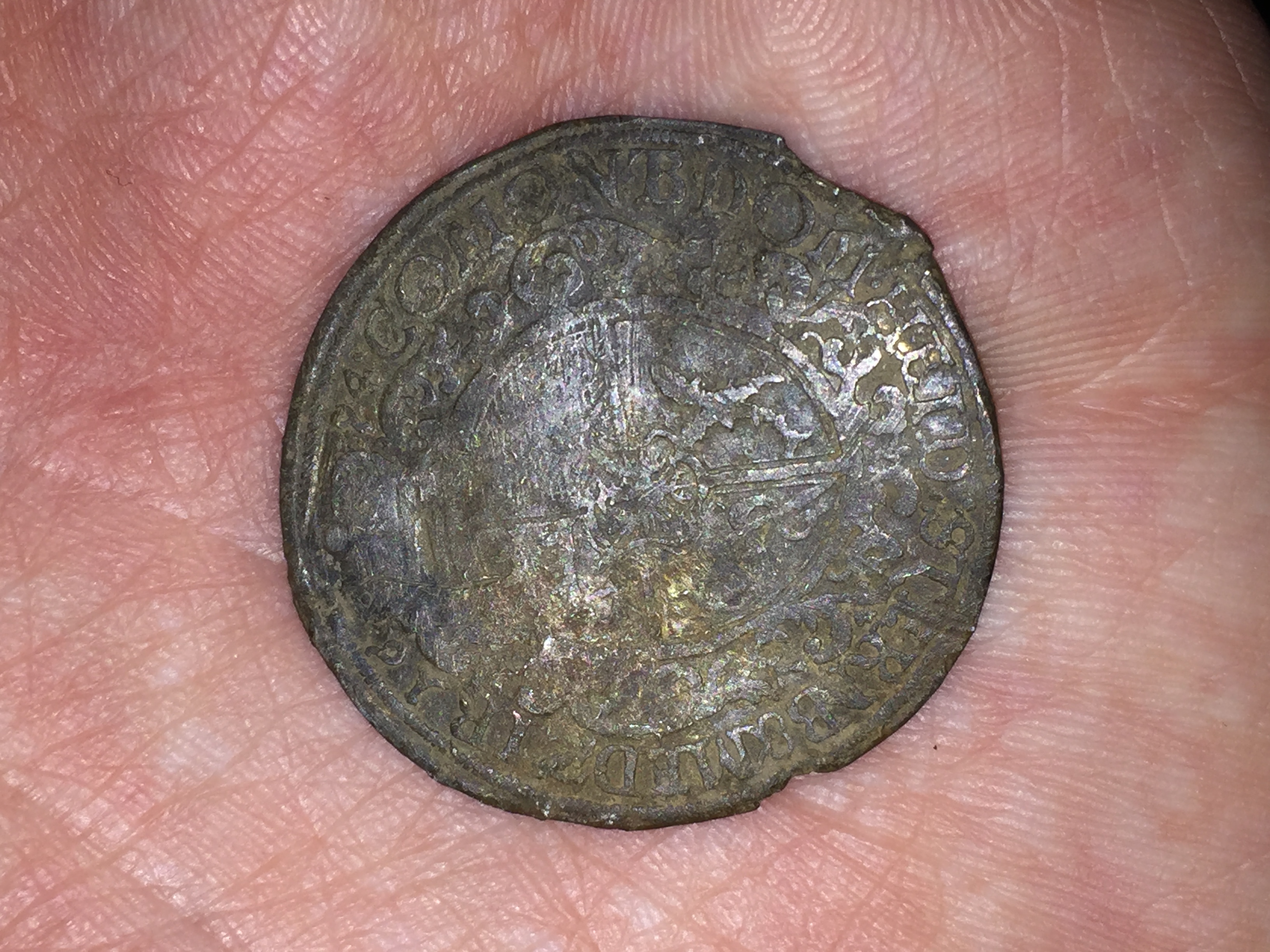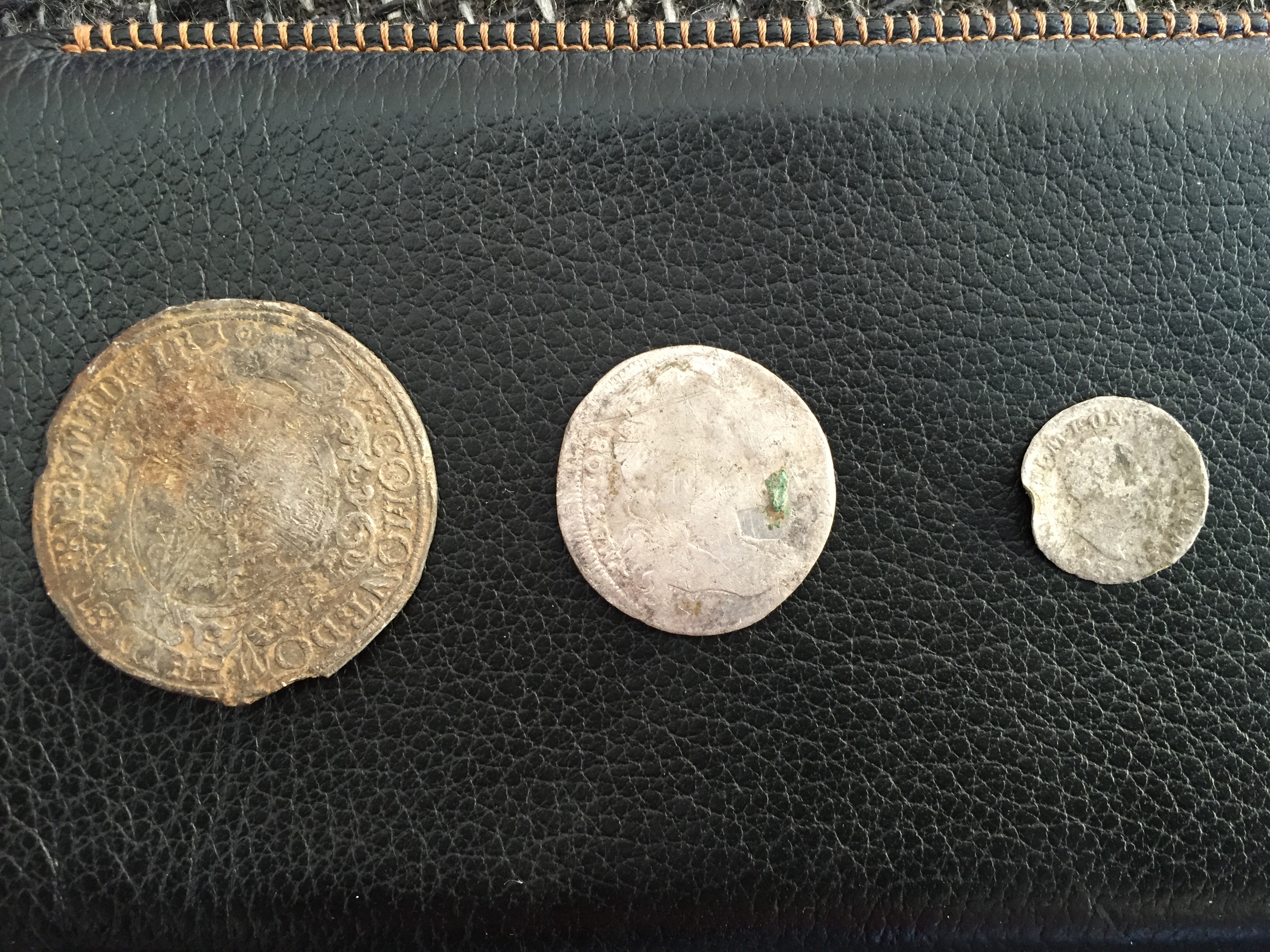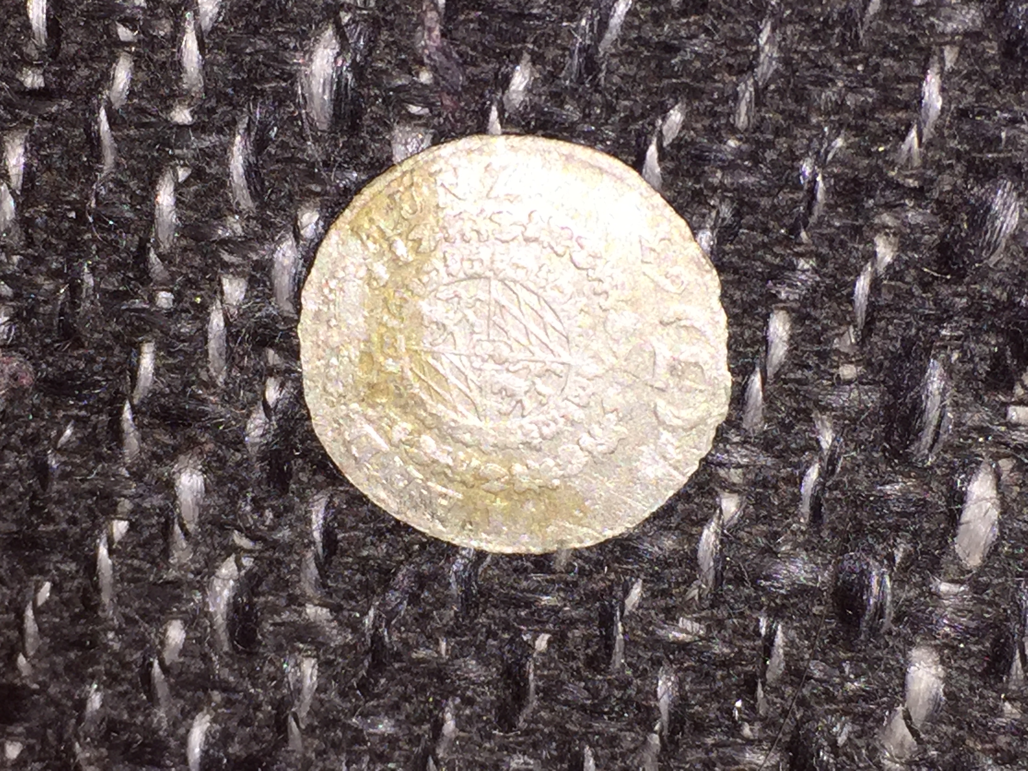 Die kleine Silbermünze kann ich auch nicht deuten in der mitte sind links so haken oder wellen und rechts 3 Löwen untereinander angeordnet, auf der anderen seite ist irgend ein kopf. Über dem kopf kann ma noch "KÖN" entziffern. Die Münze ist so groß wie 1 cent.