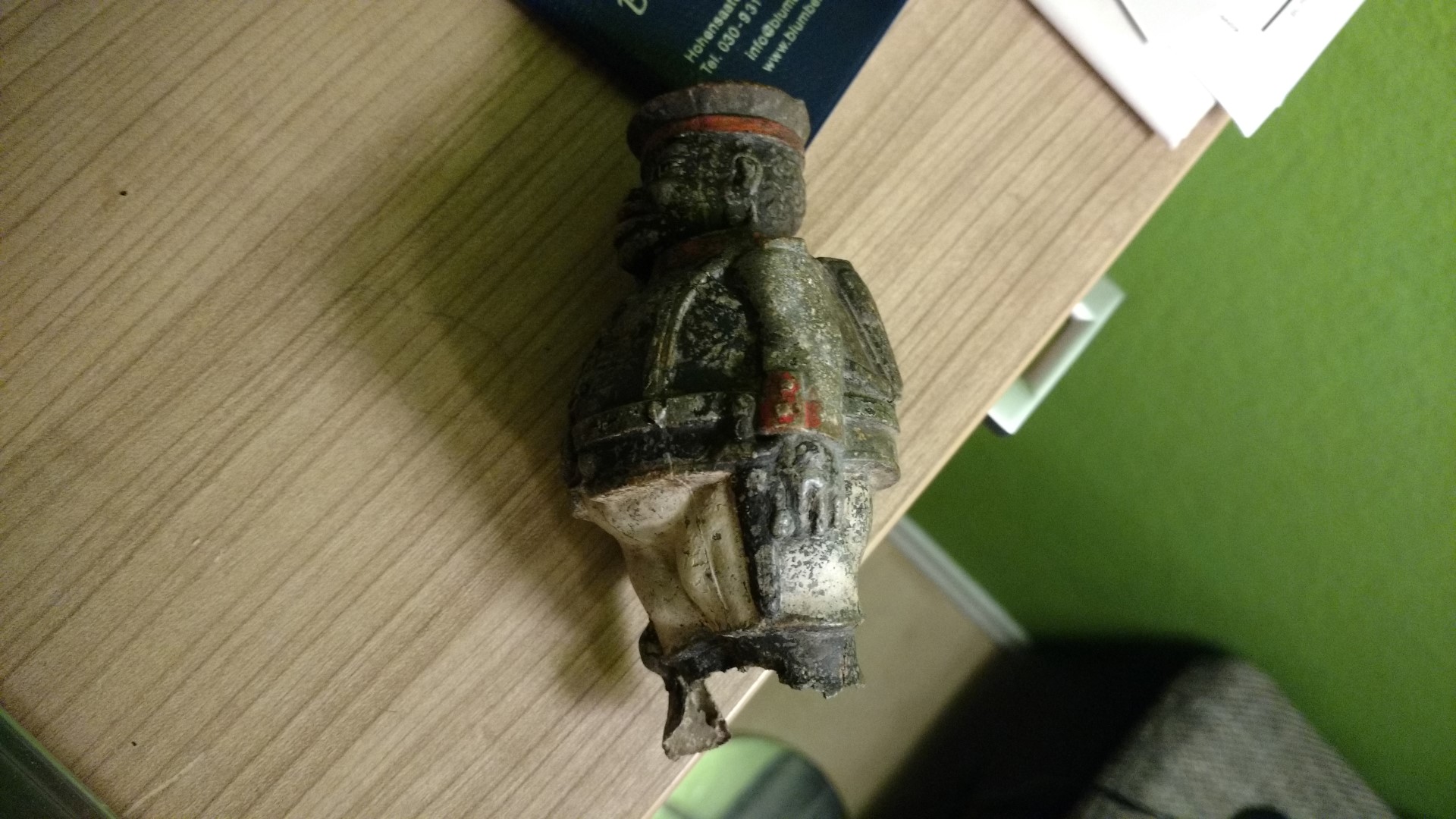Der dicke farbige Soldat(Spardose) ist aber lustig anzuschauen und dürfte noch in die Zeit vor dem 2.Weltkrieg zu datieren sein, leider ist er hinten ein wenig eingedrückt und die Füße fehlen.