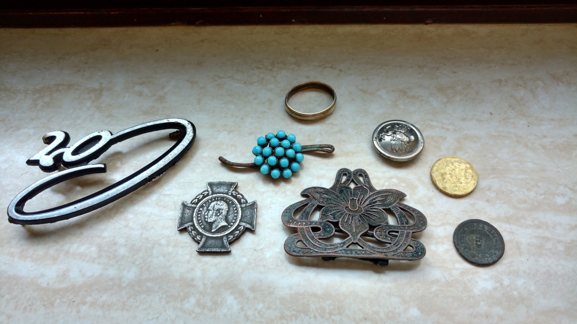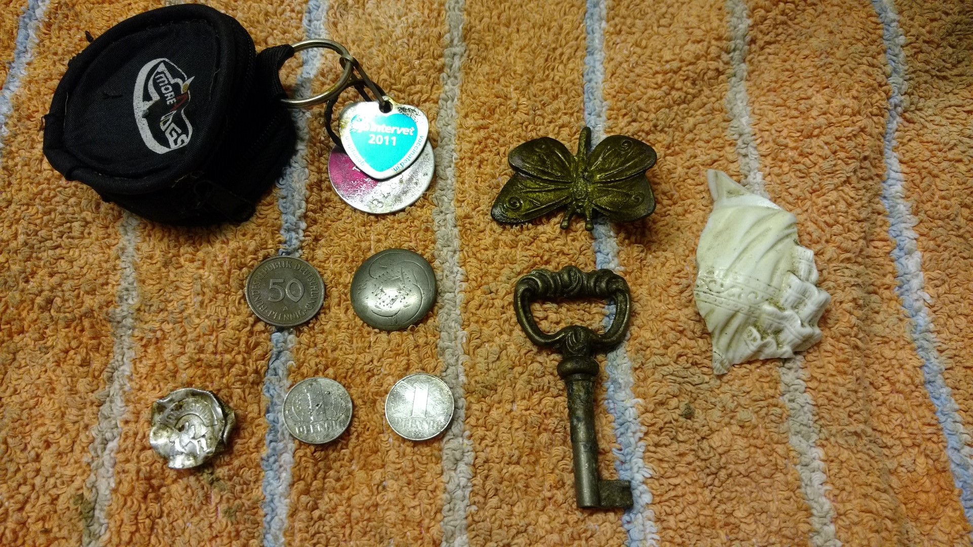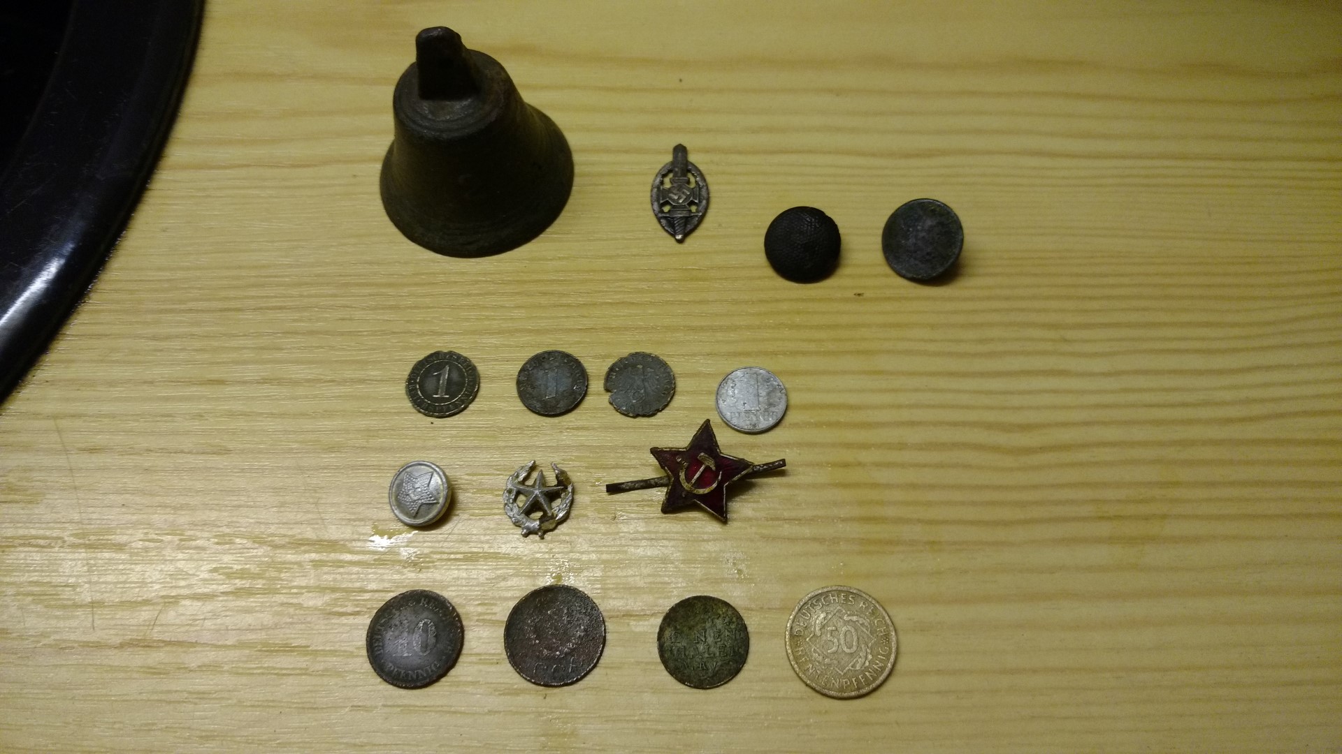 Neben unzähligen Musketenkugeln und anderen Bleigeschossen tauchten zwei 5-Pfennig-Stücke aus dem Kaiserreich, 1-DDR Pfennig und 1 Pfennig aus Adolf's Zeiten auf.
