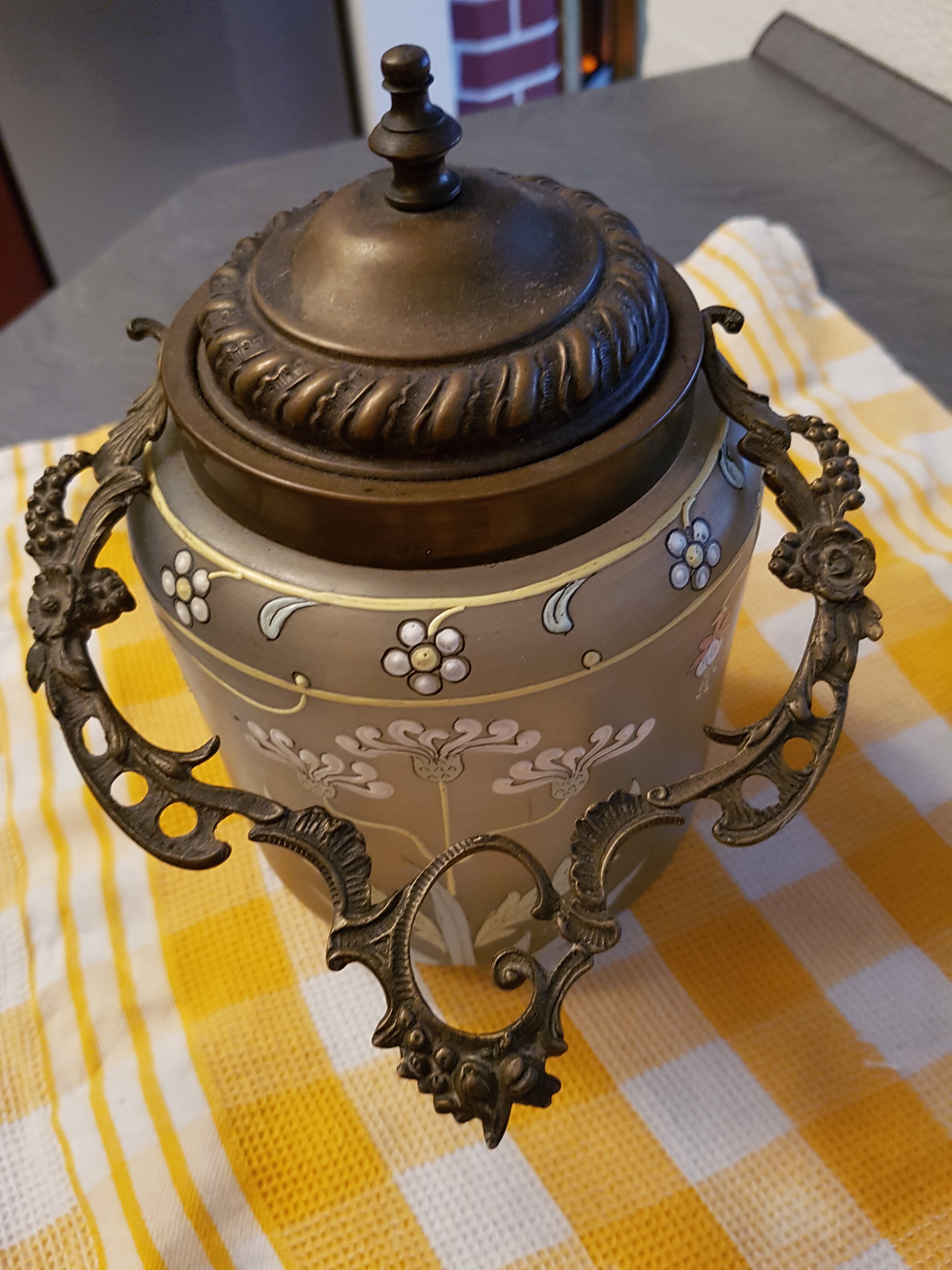 Der Behälter besteht aus grünen Milchglas und ist handbemalt.