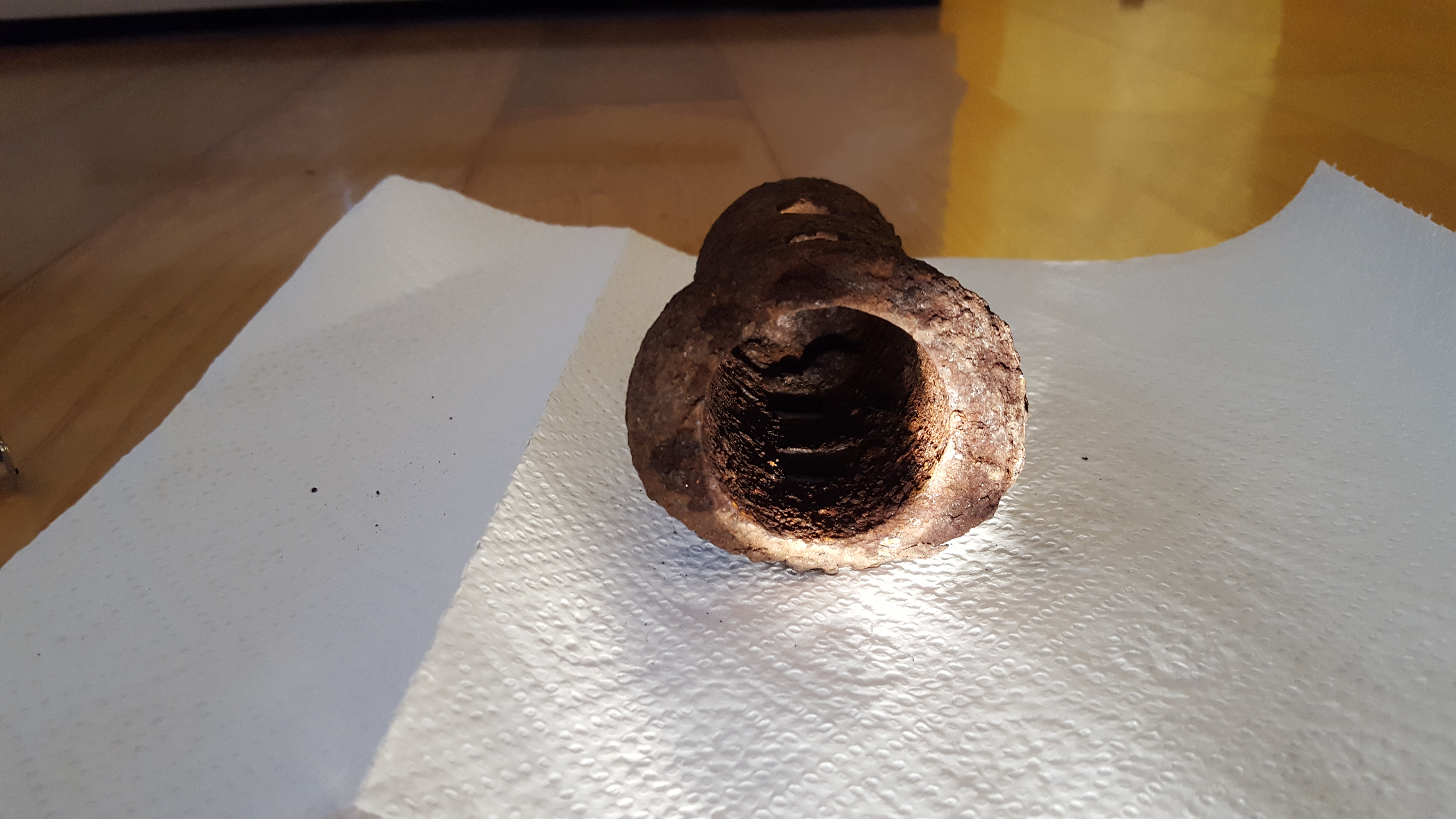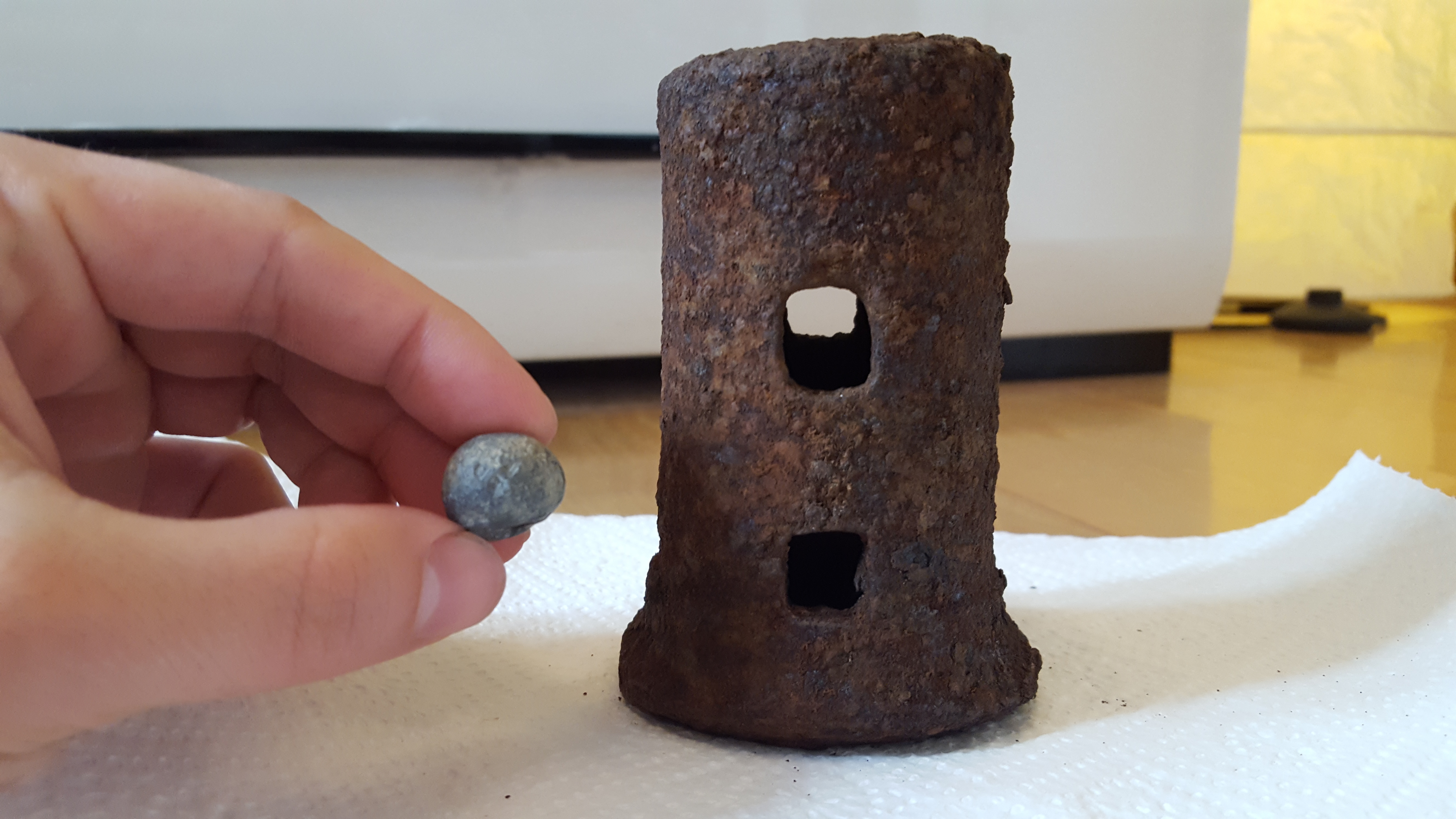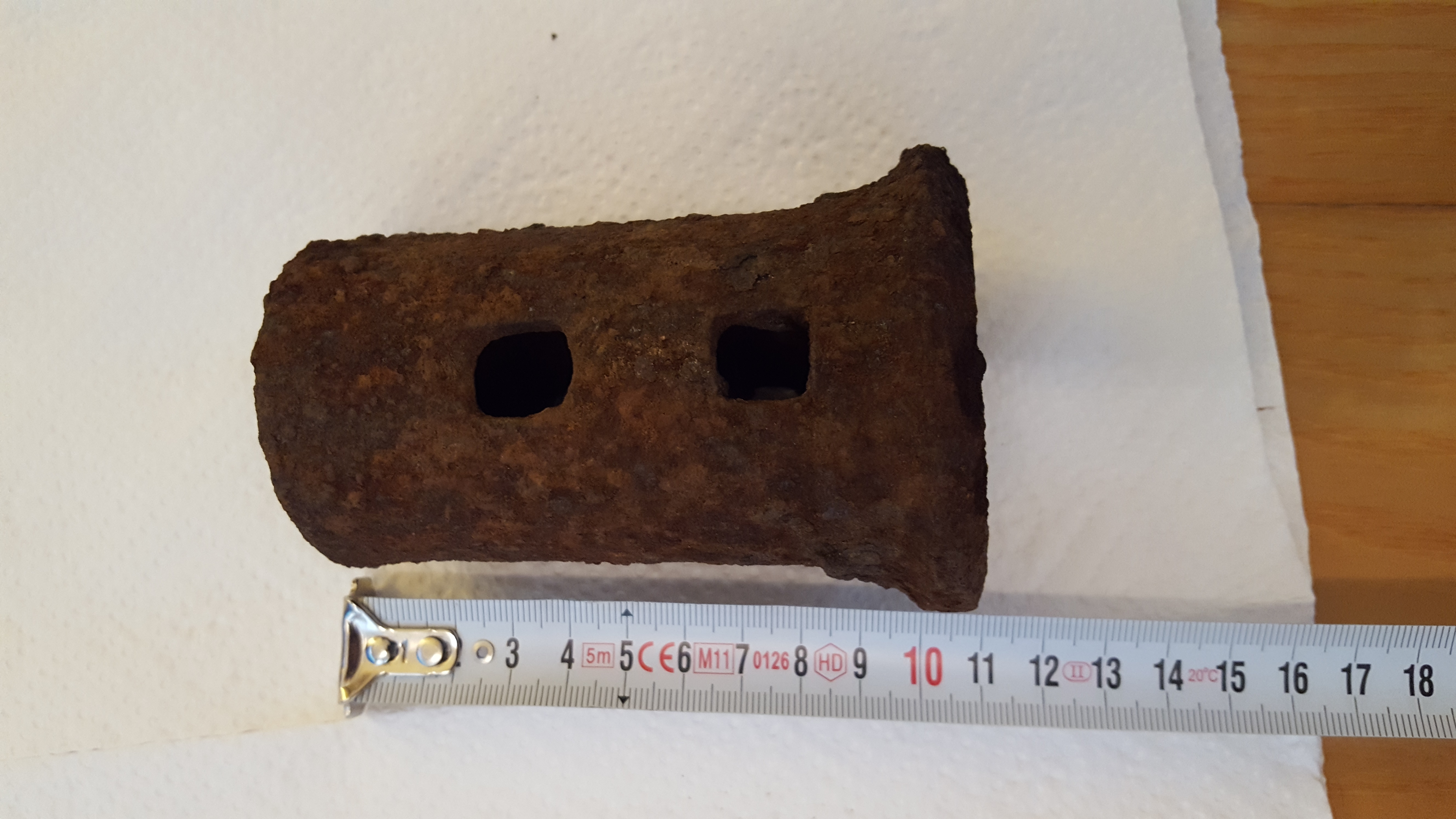 2. I dont know: Gefunden im Tiefen Wald, ein mysteröser Ort, welcher mich mit Sicherheit bald wieder sehen wird.. Das etwa 11cm hohe und 6cm breite, rundliche Objekt weißt 2 eckige Löcher vorne und 2 weitere eckige Löcher auf der Rückseite auf. Die Unterseite ist offen, dachte noch beim ausbuddeln es könnte sich um eine Art Glocke handeln...Übrigens ist es ziemlich schwer...