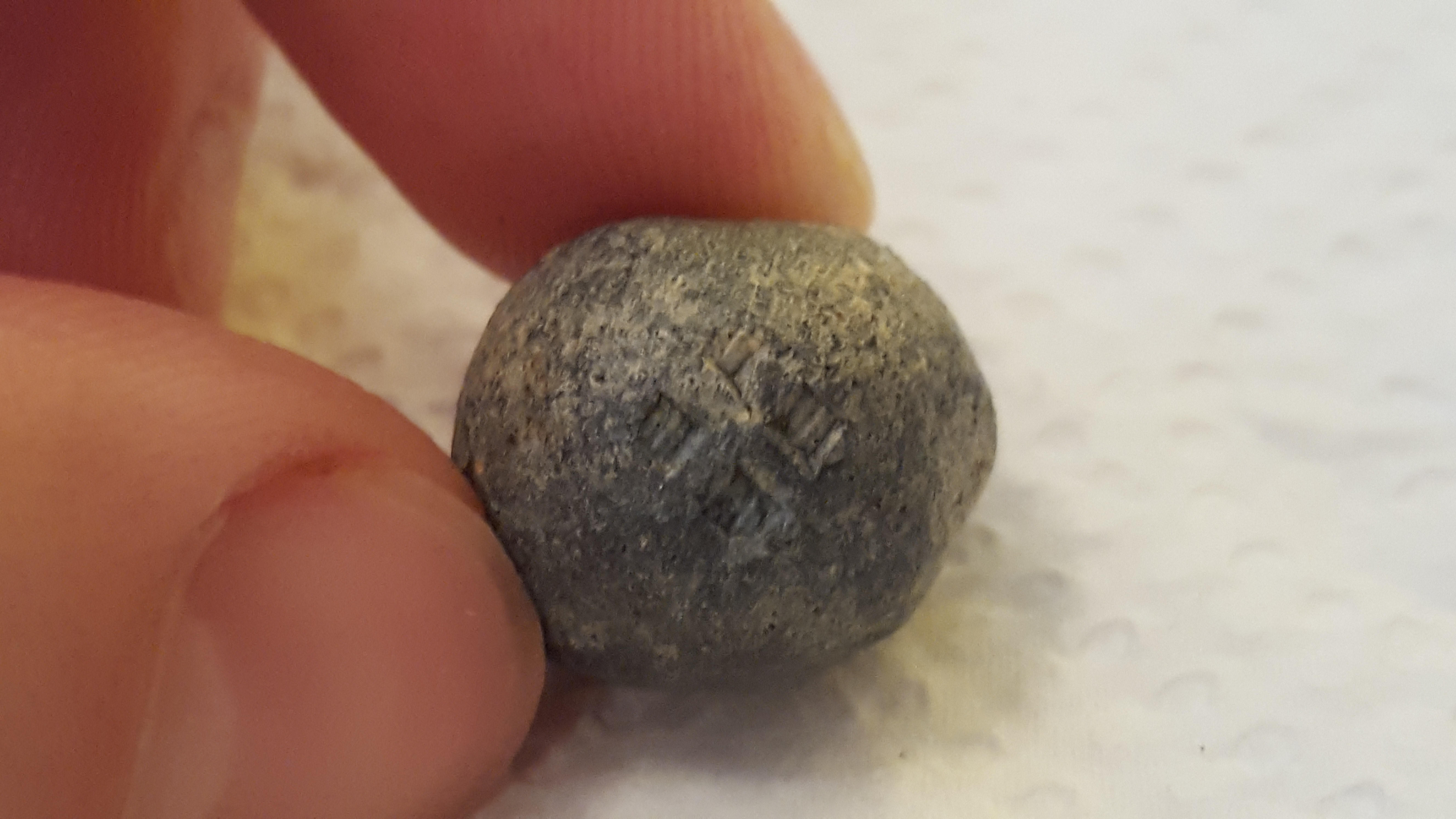 1. eine Musketenkugel der besonderen Art: Diese Kugel (übliche Größe ~1,5 cm) hat auf 4 Seiten etwas eingraviert, dass m.M. die Form eines Kreutzes(?) hat. Wie gesagt, dieses Symbol ist auf 4 Seiten der "Kugel" Abhebildet. Des Weiteren ist die Unterseite Hohl...Schmuck? Gefunden im ziemlich steilen Gelände ca 10cm unter der Erde