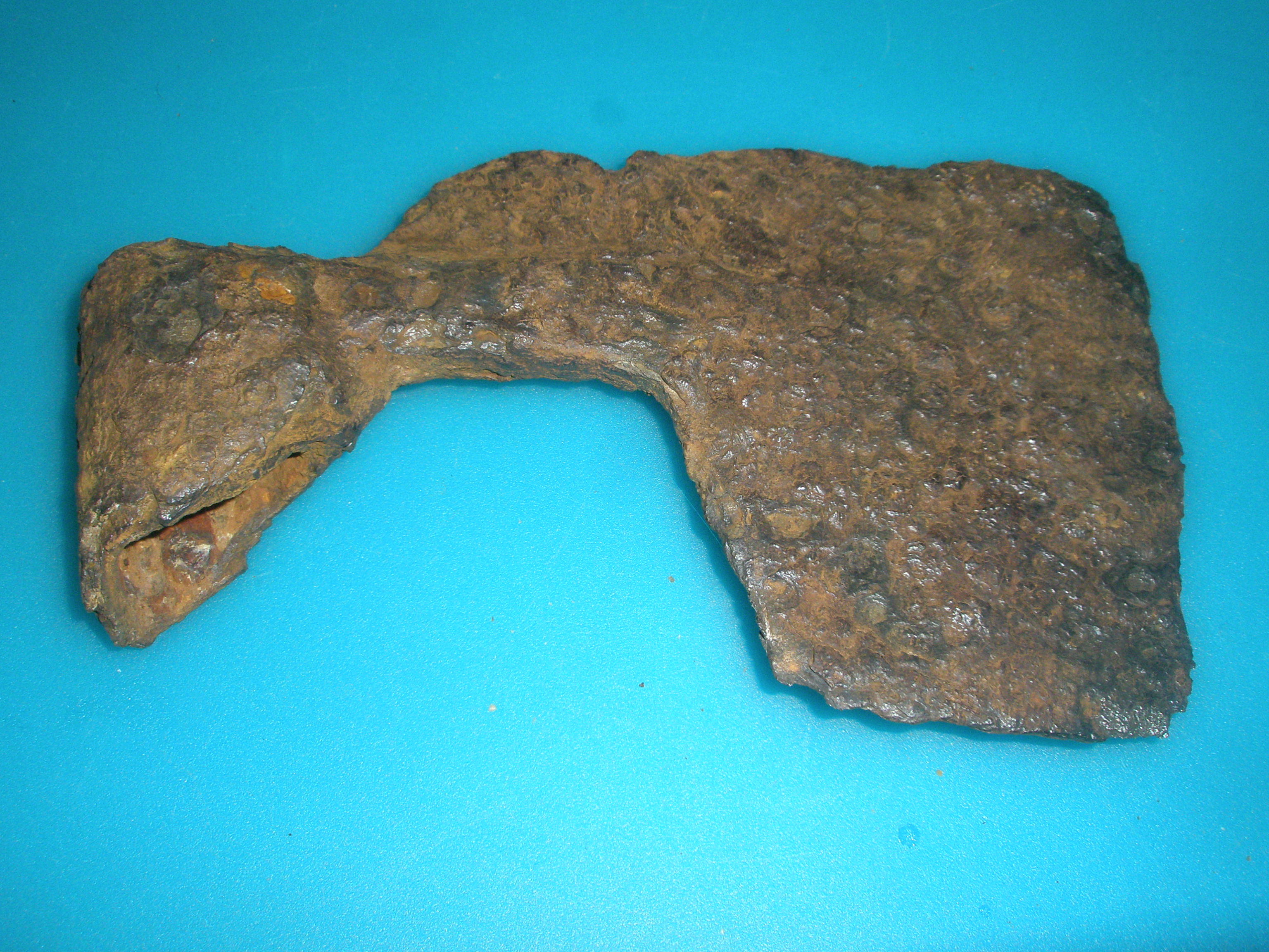 Hallo,hätte zu den beiden Teilen gerne eure Meinung! ich denk mal die Axt ist aus dem 12.-14.Jahrhundert. Das Blatt ist etwa 12cm breit.Kurioser Weise ist das Loch für den Axtstiel oben geschlossen. Das andere Teil ist etwa so gross wie ein 1 euro stück, ich vermute mal eine Art Scharnier für irgendwas.