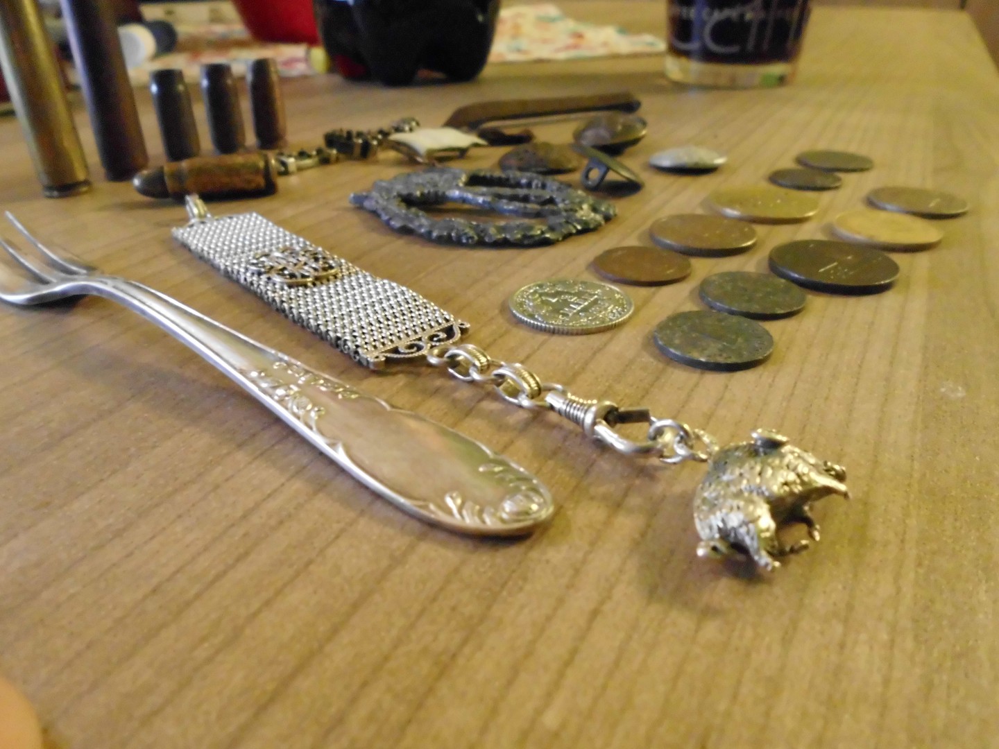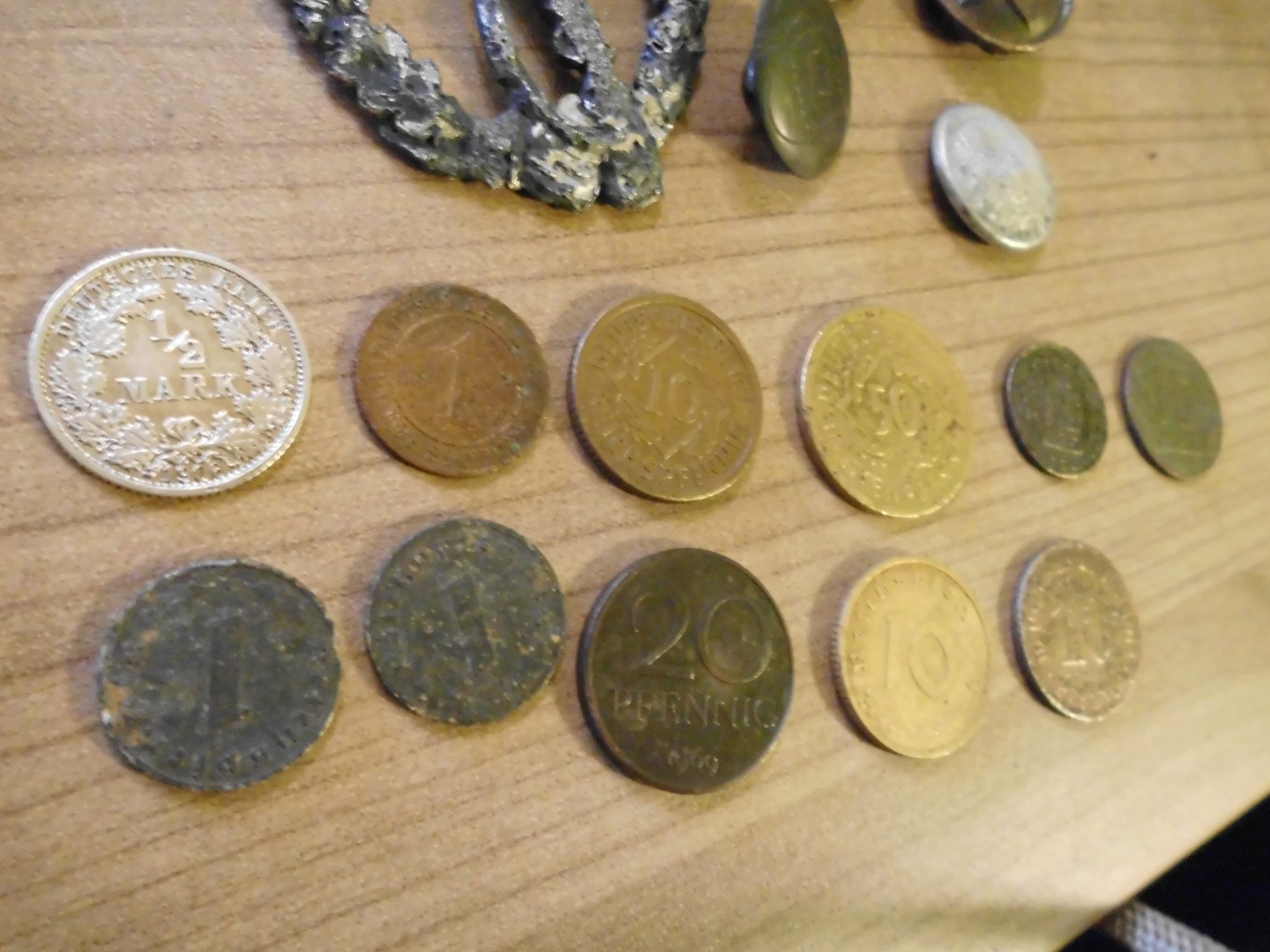 Am Ende des Tages standen wir da mit einem Reichspfennig von 1942, 10 Reichspfennig von 1935, einer Kuchengabel mit der Prägung Nowa 100 un, 1/2 Mark von 1906 silber(Fuck haben wir uns gefreut :lol: ) und einem, ja was auch immer es ist...Band, mit einem kleinen Wildschwein als Anhänger.