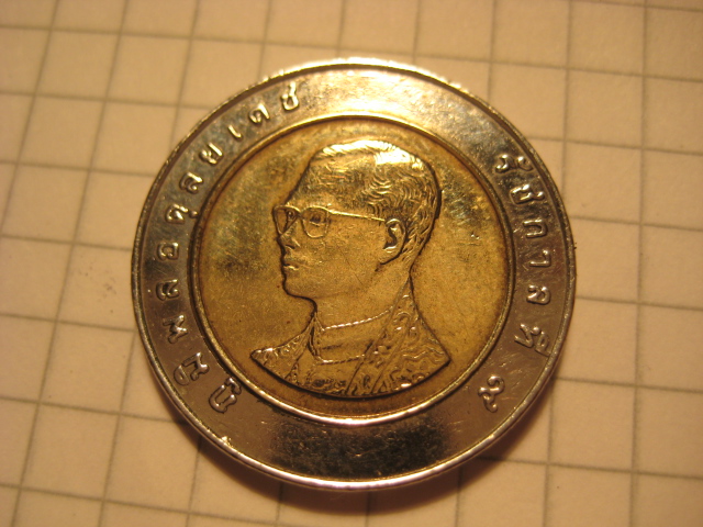 Das sind 10 Baht aus Thailand - mit König und Tempel.