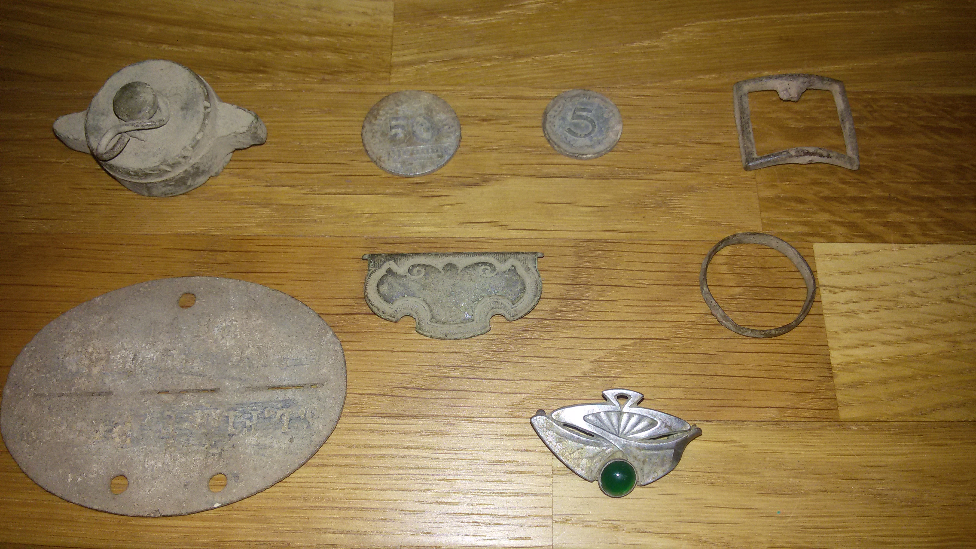 Ring, Silberner Anstecker, Erkennungsmarke auf der man allea erkennt, Teil einer Gürtelschnalle, Robuster Flaschenverschluss, eine Schnalle, und zu guter letzt ein 50 und ein 5 pfennig Stück