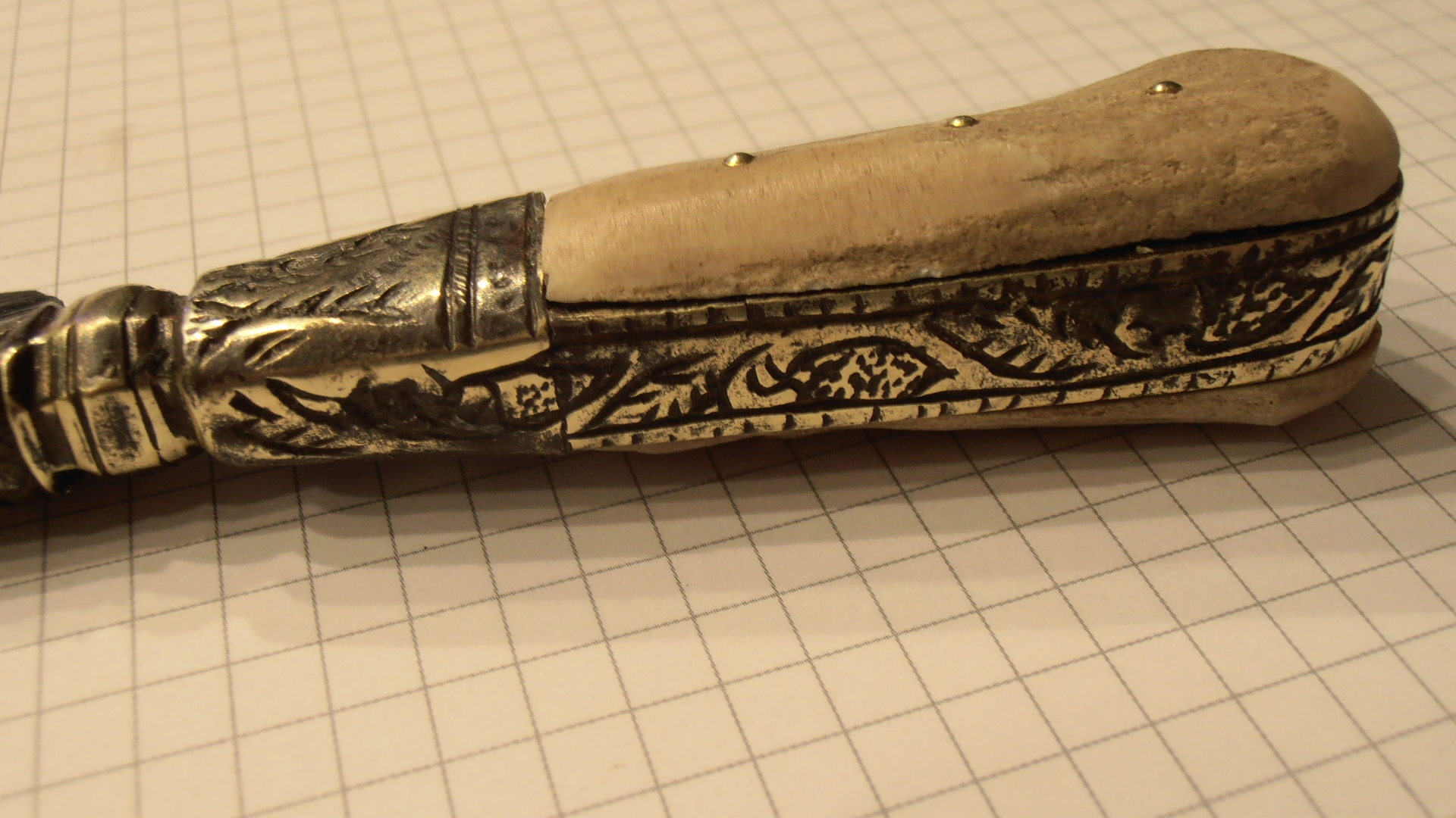 Der Griff ist mit einem ca. 1mm dickem Messingblech überzogen, und eine Länge hat es von ca. 20cm.