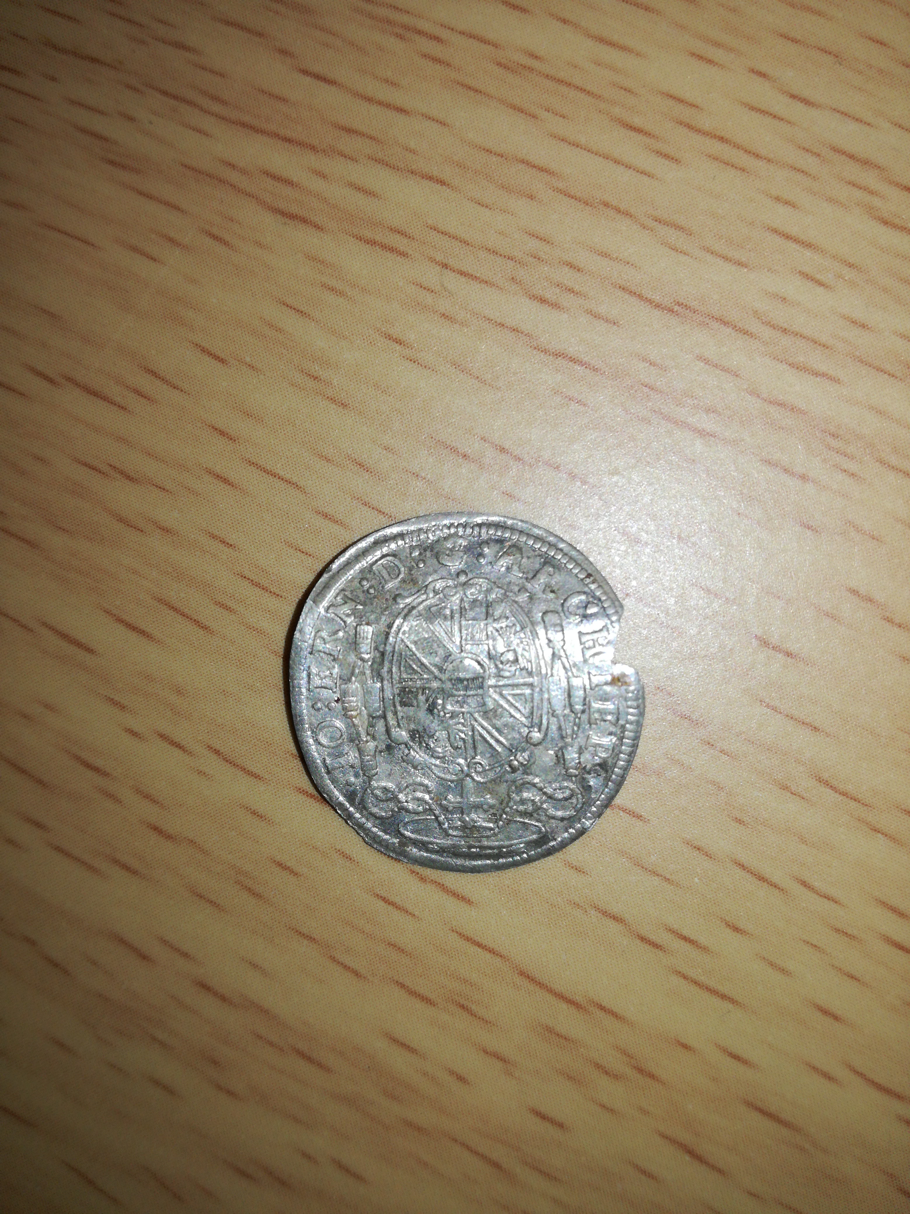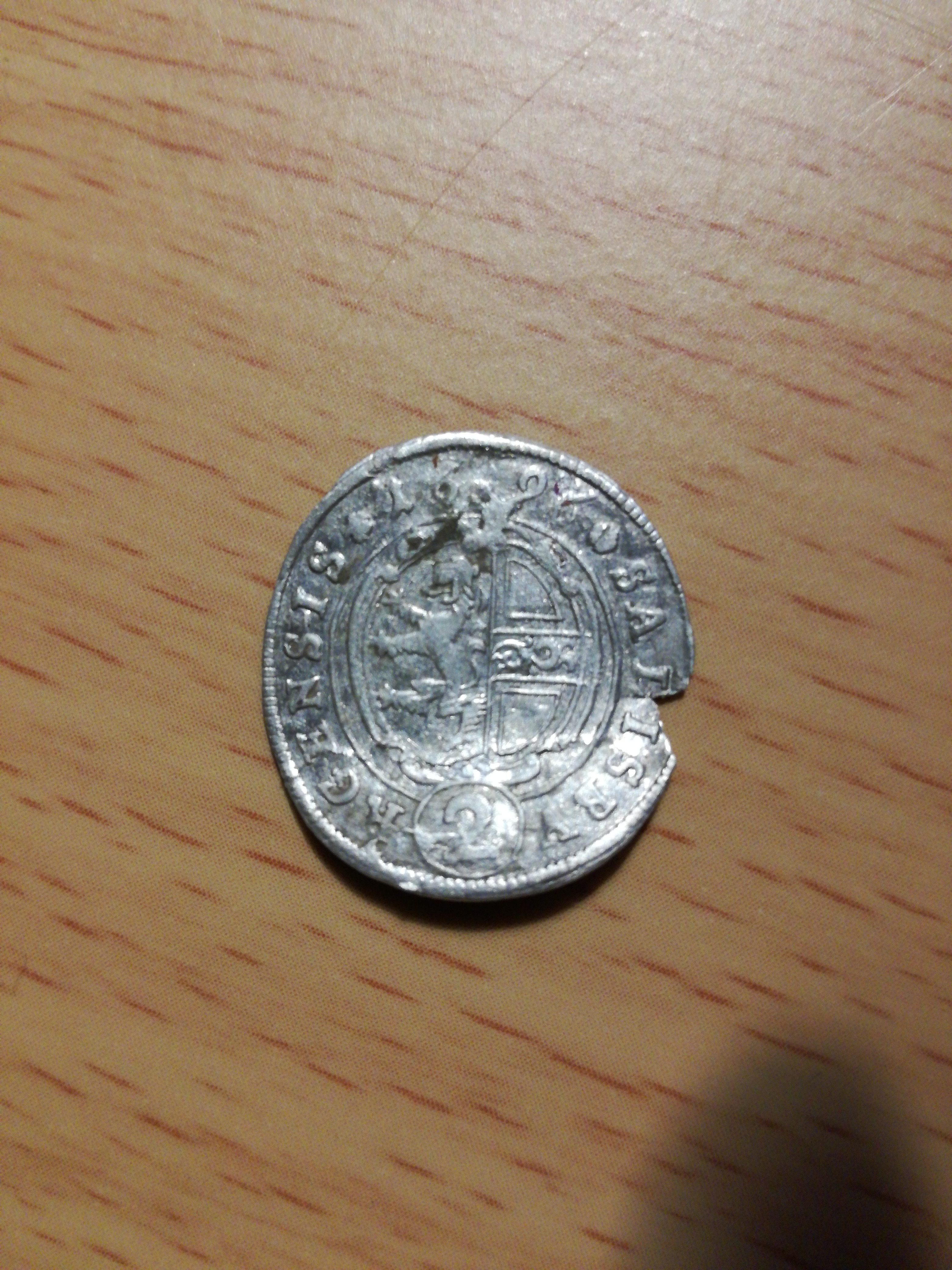 Ich habe diese Silbermünze gefunden. Ich konnte erkennen, dass sie von 1696 ist, habe aber keinen Plan, was die Außenschrift bedeutet.