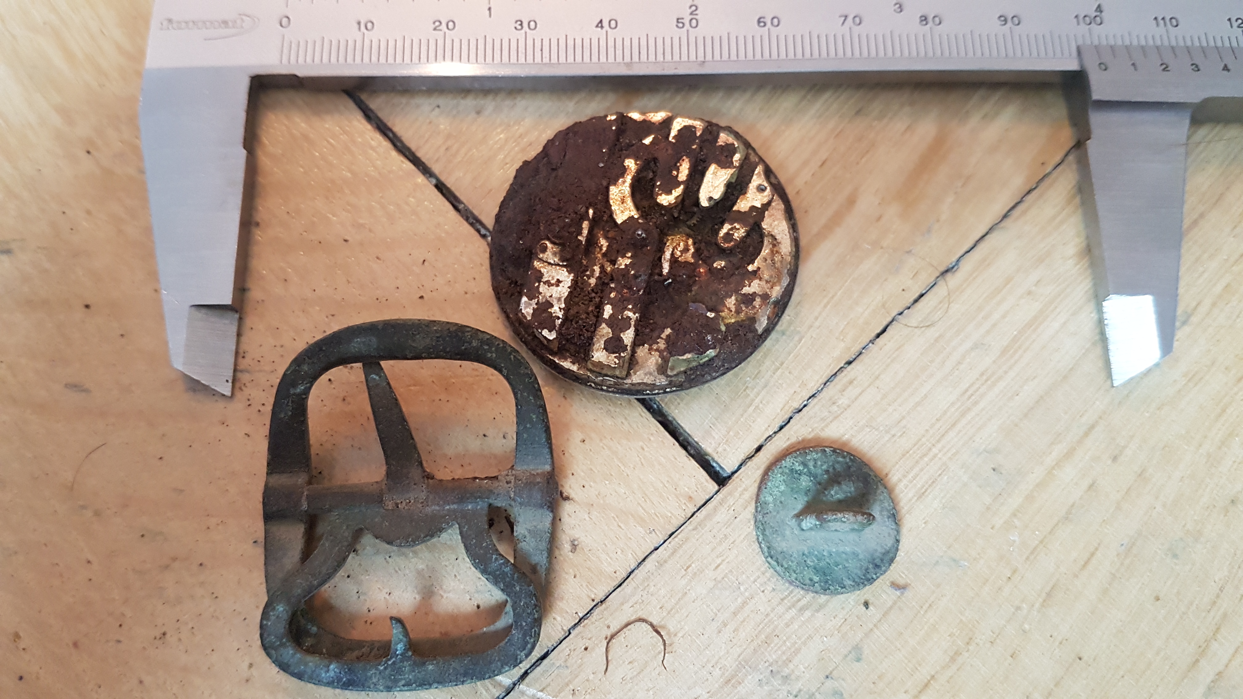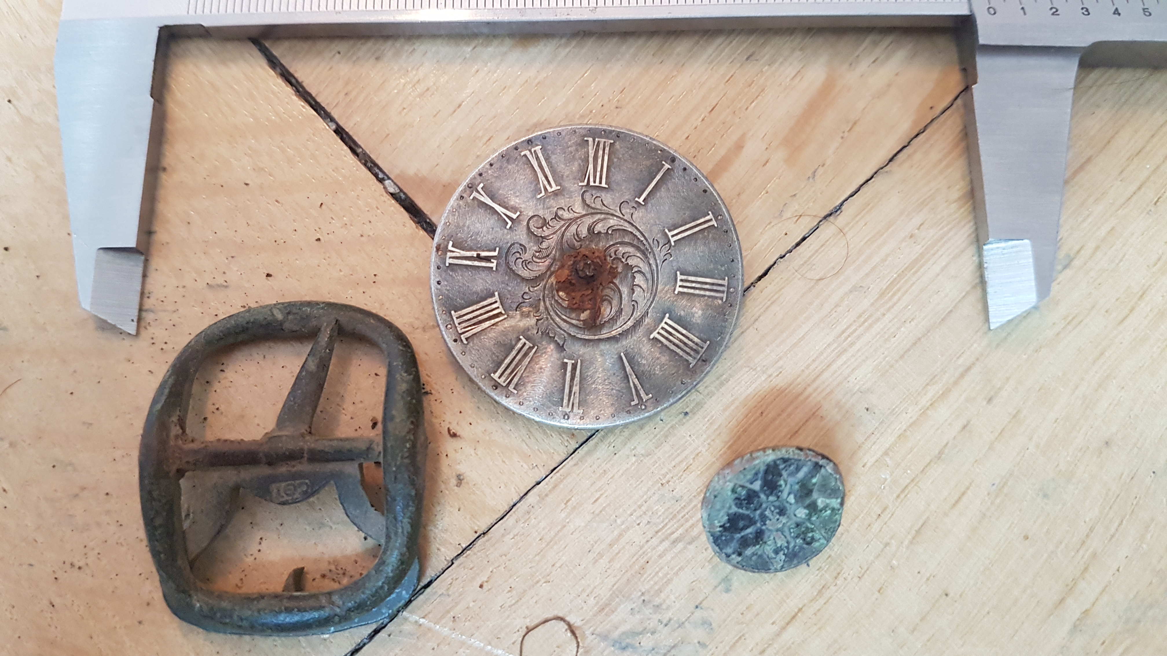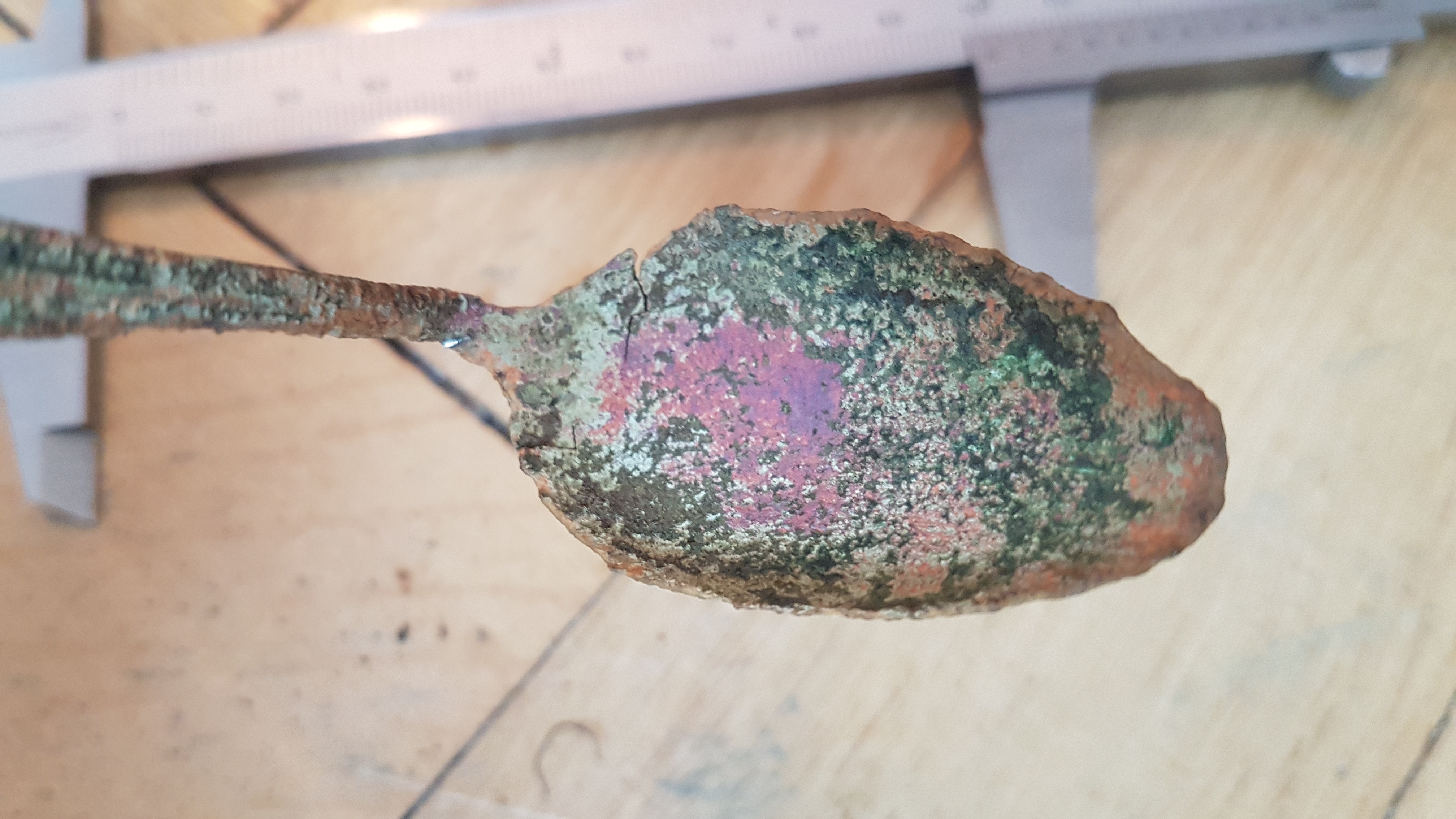 Den Knopf im 2. Und 3. Bild habe ich auch schon 2 mal gefunden, der kommt so aus dem 17. Jahrhundert. Der Löffel besteht wahrscheinlich aus Messing und kommt aus dem späten 19. Jahrhundert.