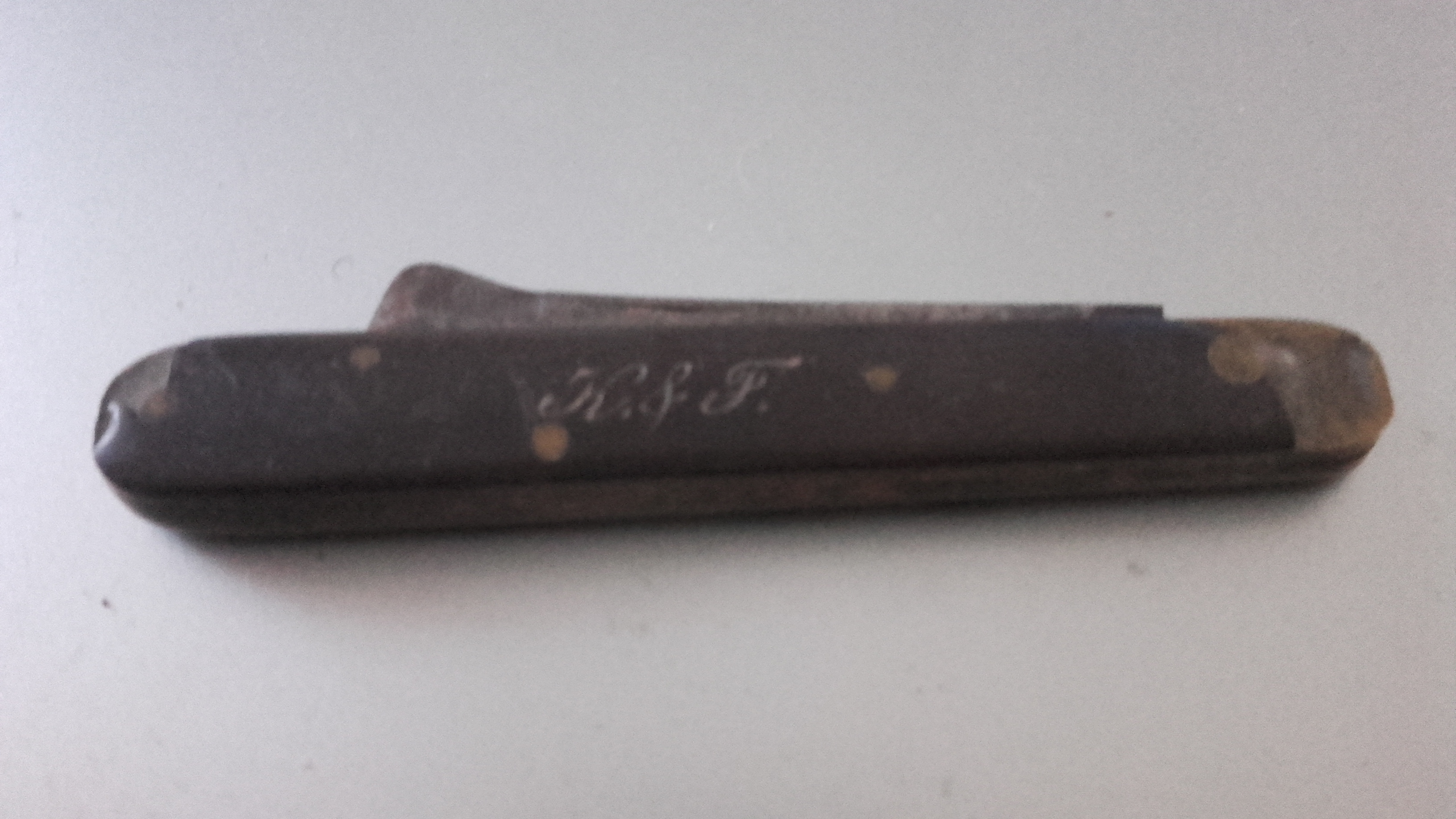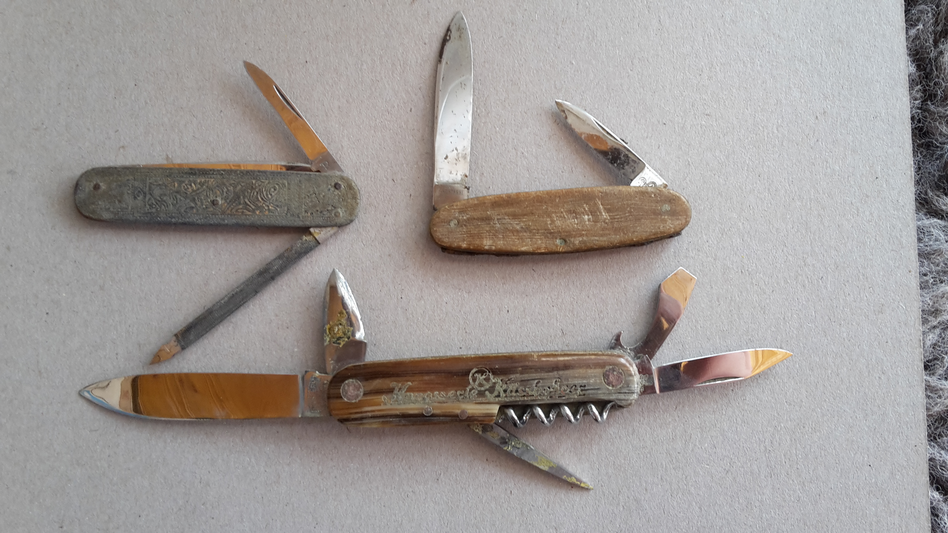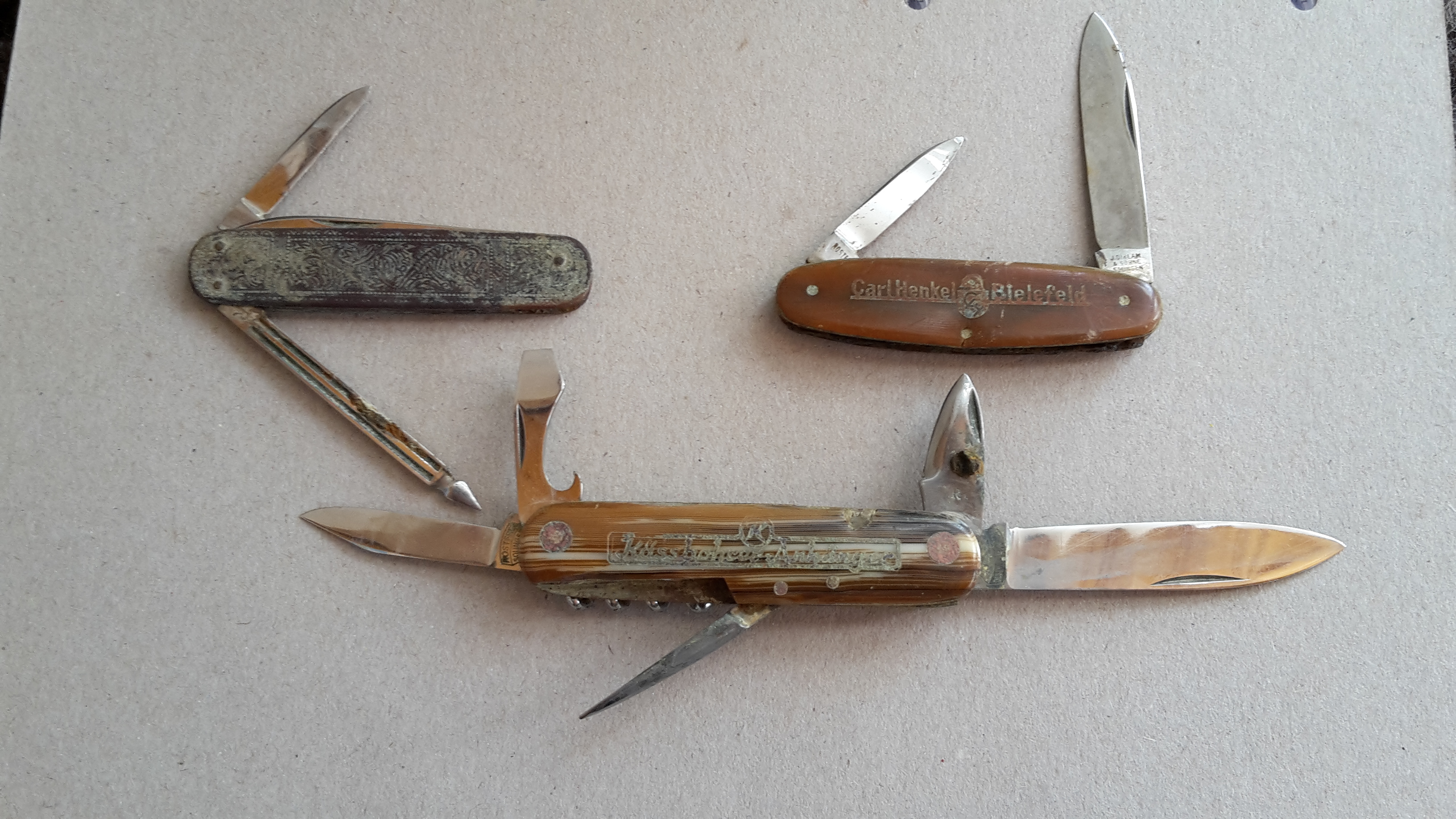 Hier mal meine drei Taschenmesser die noch zu retten waren als sie aus der Erde kamen. Ein Karosserie Kässbohrer ca. 50er jahre. Nen Carl Henkel Messer aus Bielefeld (seit 1871 Ausrüster für die Feuerwehr).