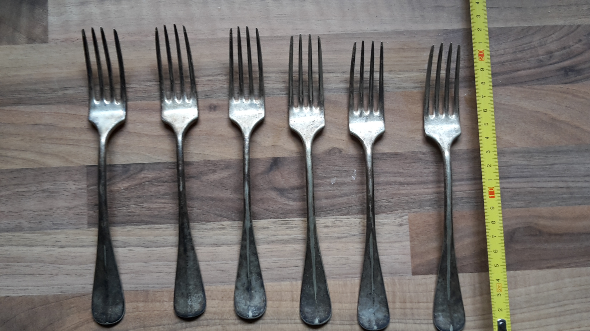 6 Gabeln kupferfarben,sehr stabil und schwer,möcht ich meinen. gewicht : von 62 - 67,3 gramm. Damit könnte man gut ein Wildschwein abstechen,ohne das die Gabel