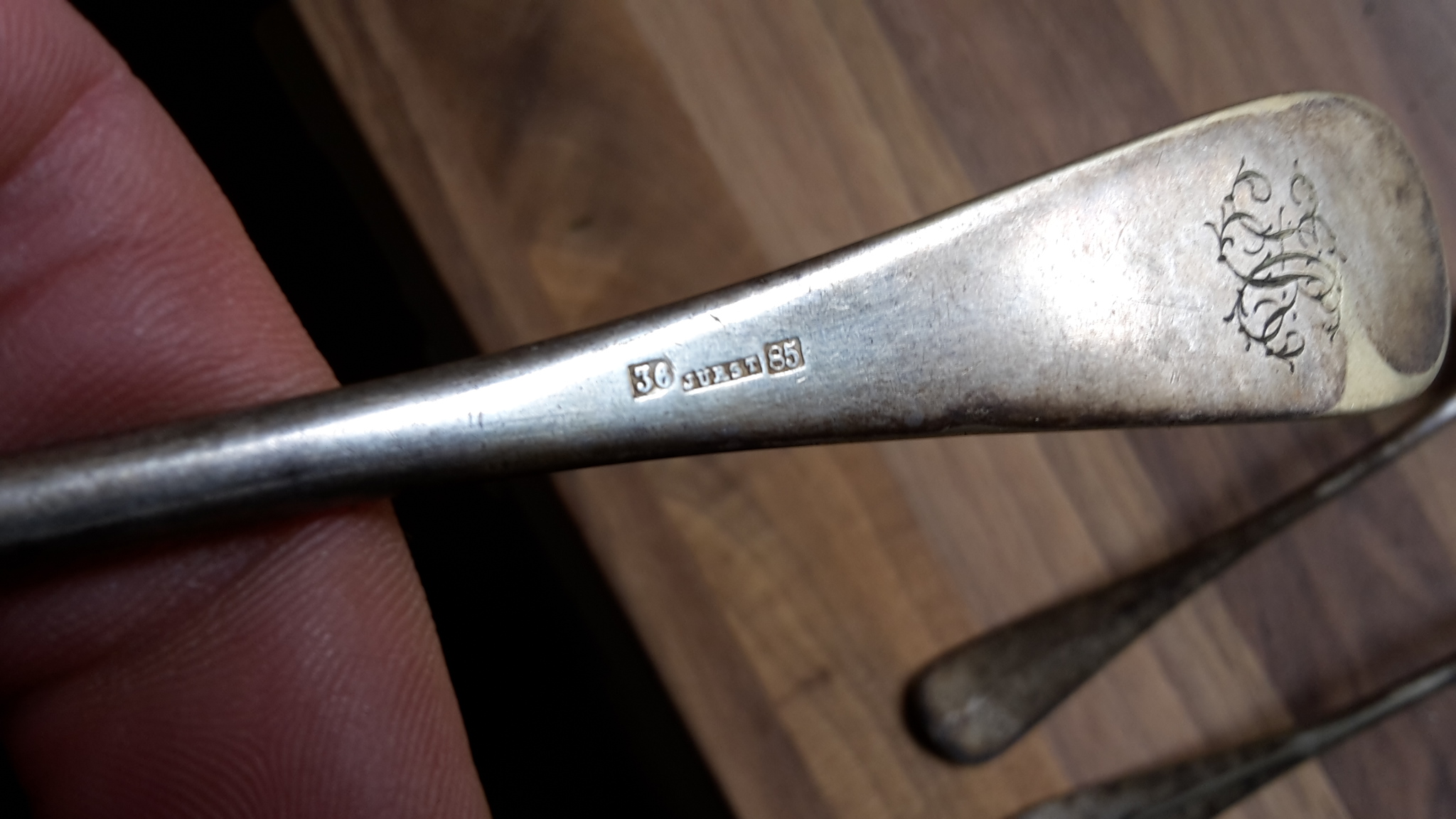 Besteckteile sind aus Alpacca (Neusilber, Nickelsilber). Zahlen haben nichts zu bedeuten, was Silbergehalt betrifft. Farbe ist gelblich. Vorsicht Fälschungen im Umlauf, wird als Silber verkauft!!!