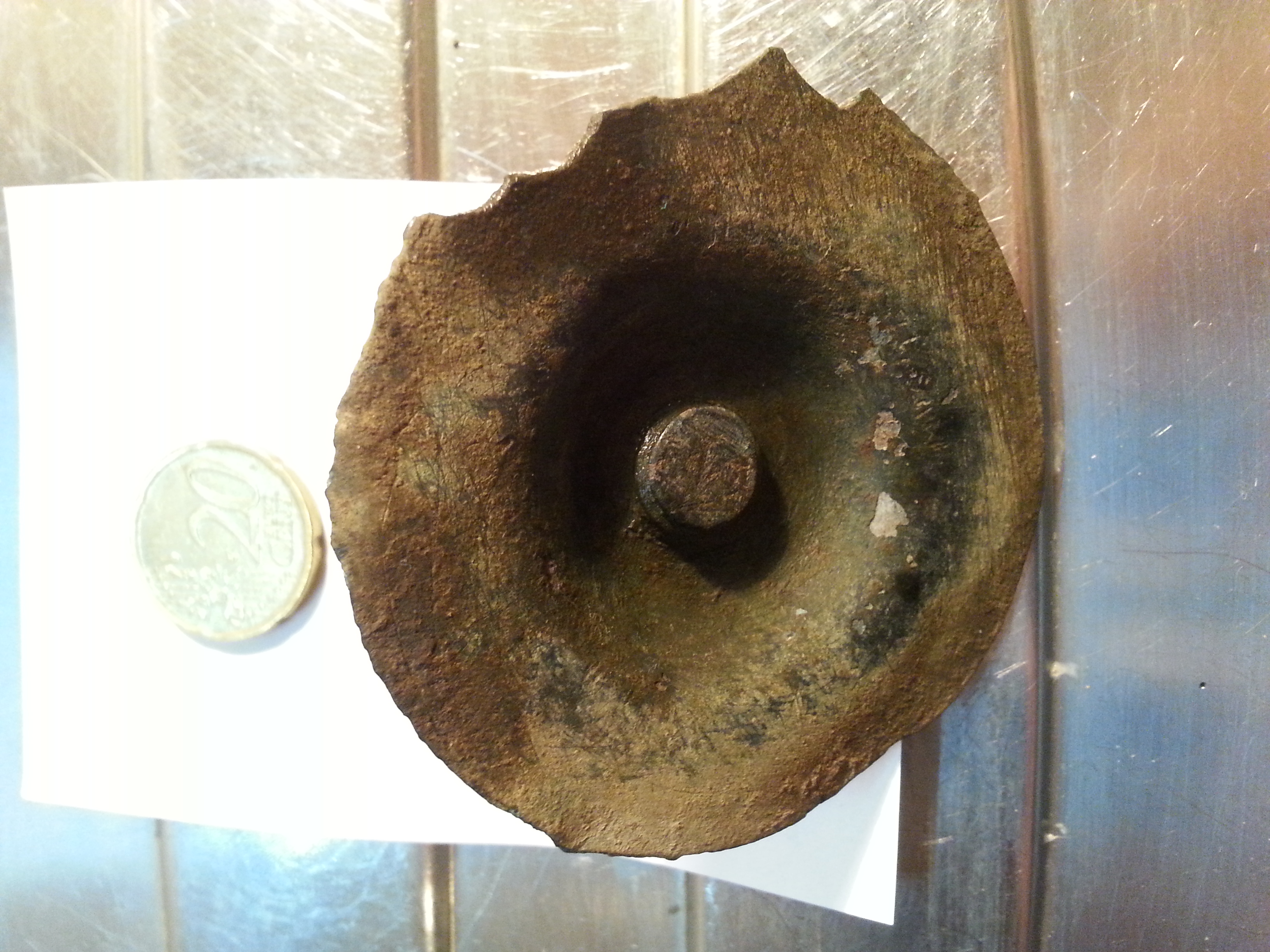 Bild 1+2 Das Ding ist leicht gewölbt, hat innen einen kreisrunde Linie, der abgebrochene "Griff" ist nicht hohl