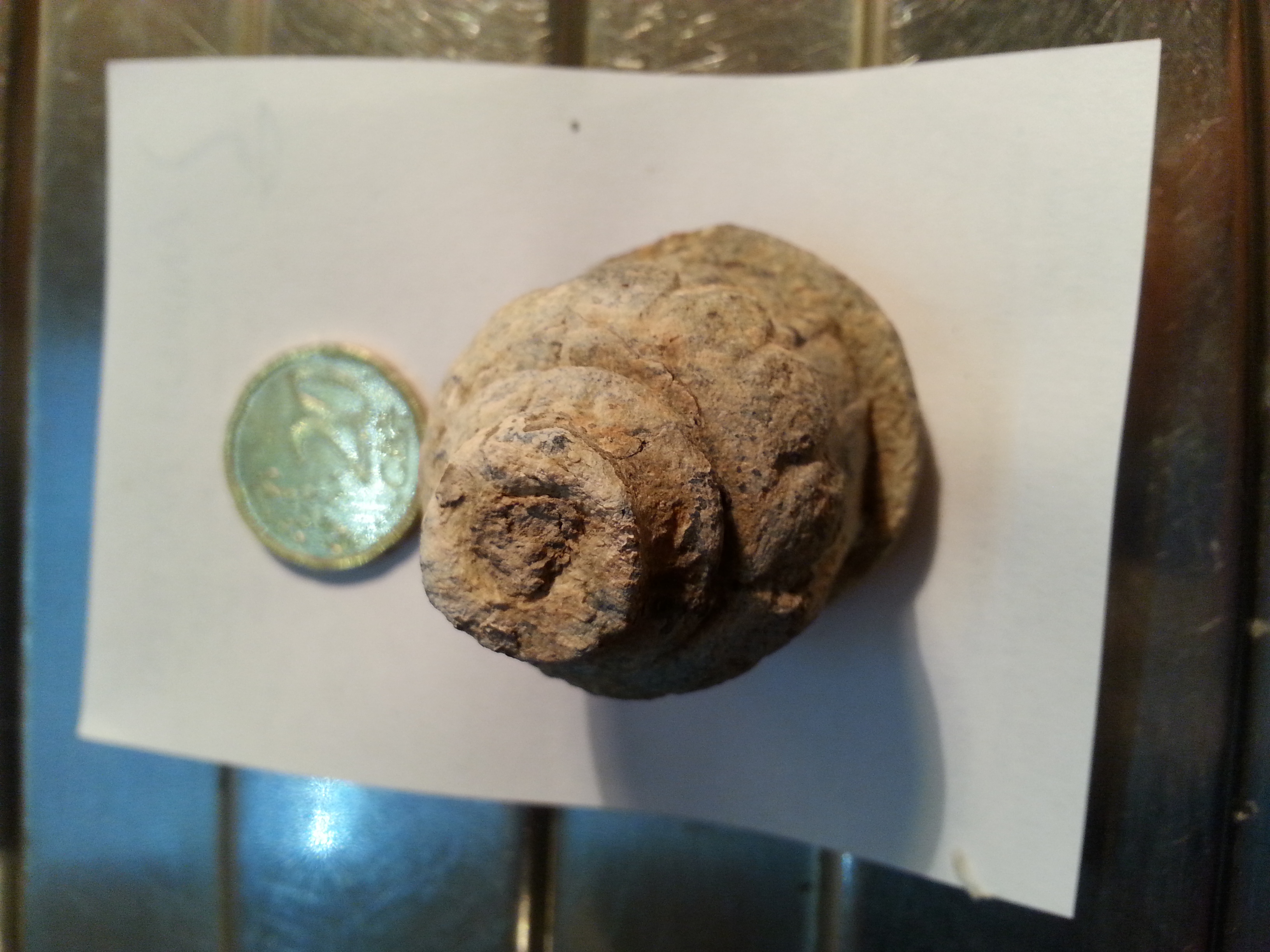 auch bei dem hier keine Ahnung was es sein könnte. Es sieht aus wie eine Blume. Material ist denke ich Blei. Es komplett gefüllt, nicht hohl. Auf der Unterseite scheint eine andere Art von Metall zu sein, welches sich biegen lässt. Aber ob das nachträglich (durchs Pflügen) oder absichtlich dort angebracht wurde, keine Ahnung.