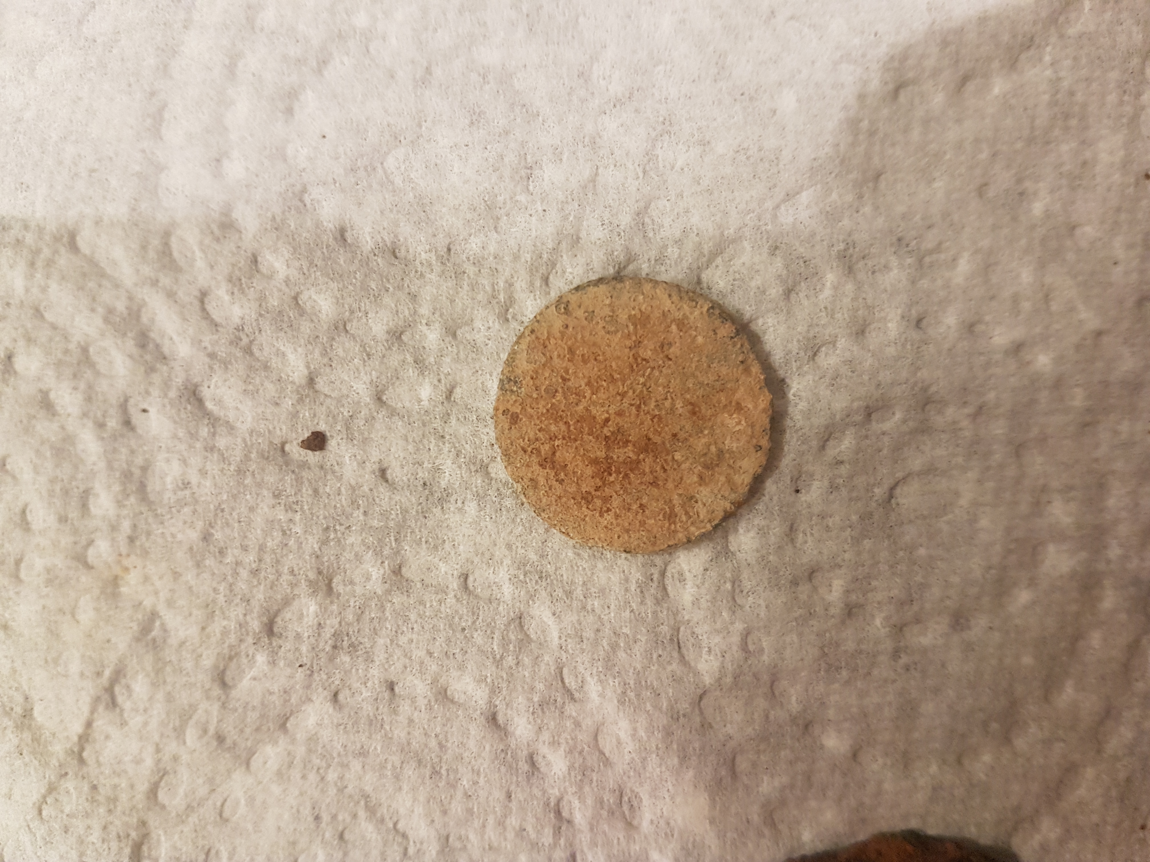 Die Münze ist leider so verwittert, dass nichts mehr zu erkennen ist. Sie ist hell und hat einen Durchmesser von 2 cm.