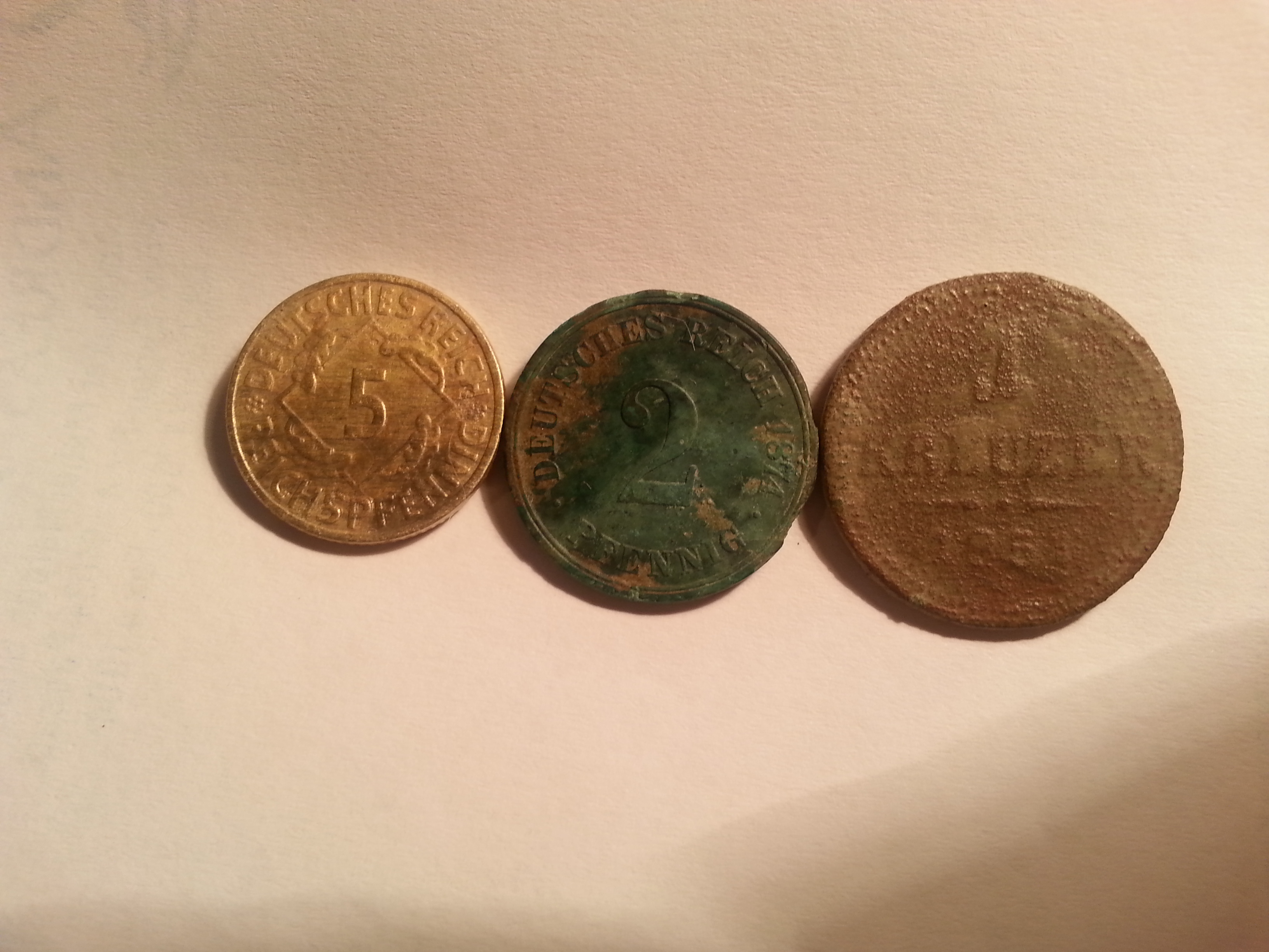 5 Reichspfennig 1925 (Messing), 2 Pfennig Deutsches Reich 1874 (Bronze) und 1 Kreuzer 1851 (Kupfer)