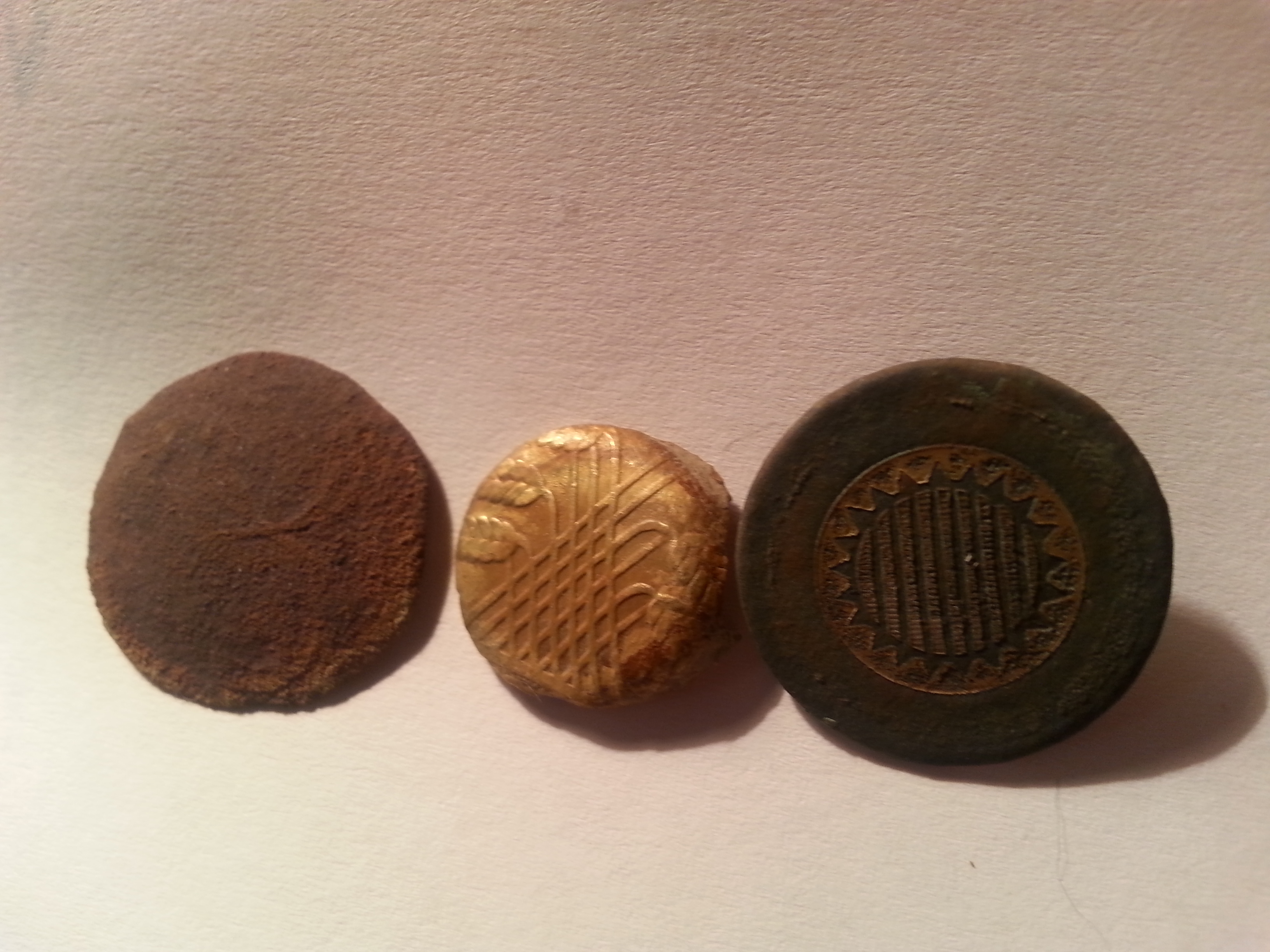 Uniformkopf mit Nummer 8 (Kupfer), hier wollte wohl jemand aus ner Münze nen Knopf machen :) und Knopf mit schöner Verzierung