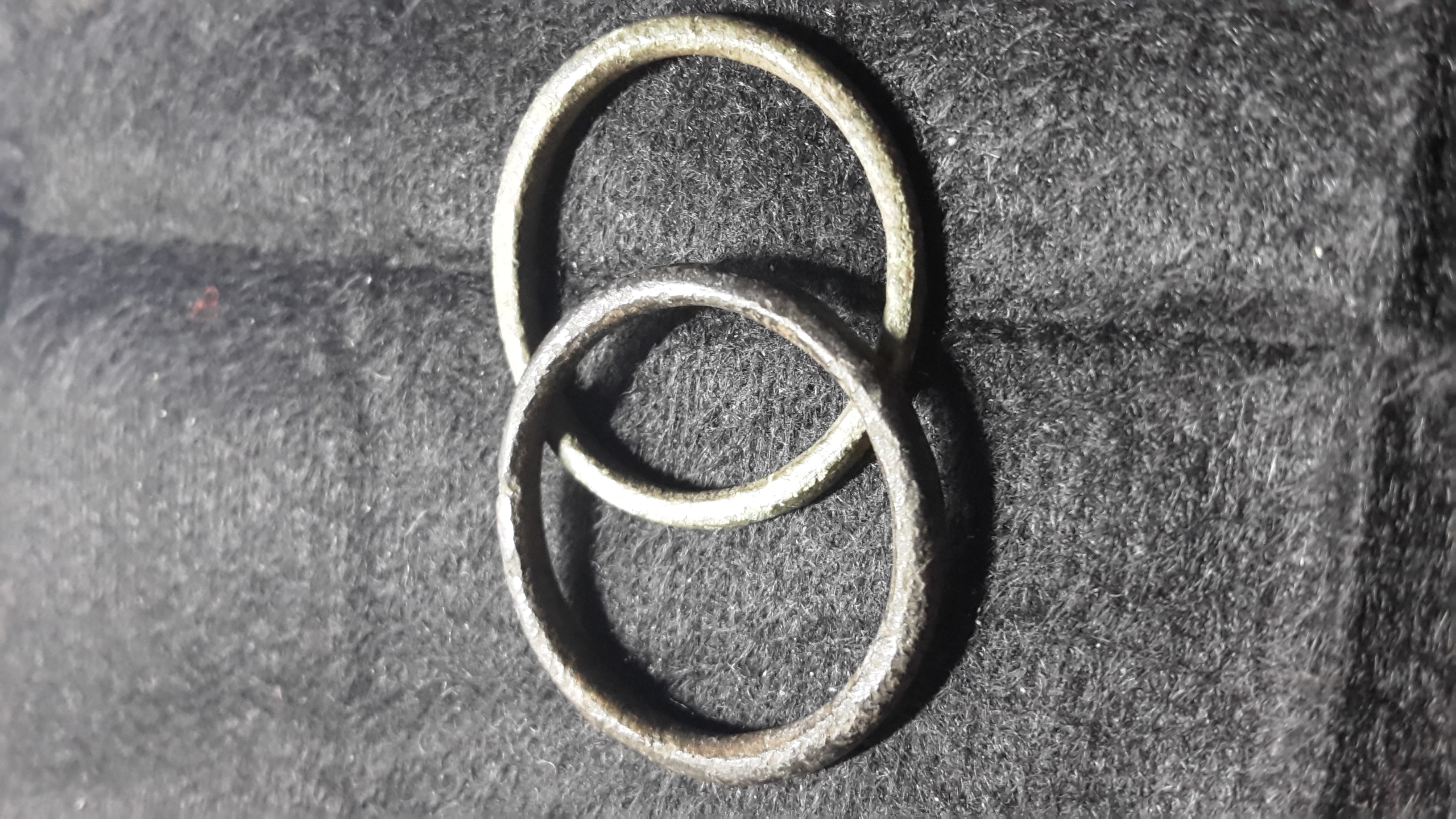 Hat jemand eine Idee was das für Ringe sein könnten? Habe diese recht Nahe beieinander gefunden. An dem gleichen Ort habe ich auch schon einiges an römischer Keramik gefunden. Doch dass die Ringe römisch sind bezweifle ich irgendwie. Der kleine Ring kann man etwa auf den kleinen Finger setzen und den grossen Ring auf den Zeigefinger. Die Ringe sind sehr fein und fragil. Ich bezweifle also, dass diese einen grossen praktischen Nutzen hatten. Material: unbekannt, hat jemand eine Idee?