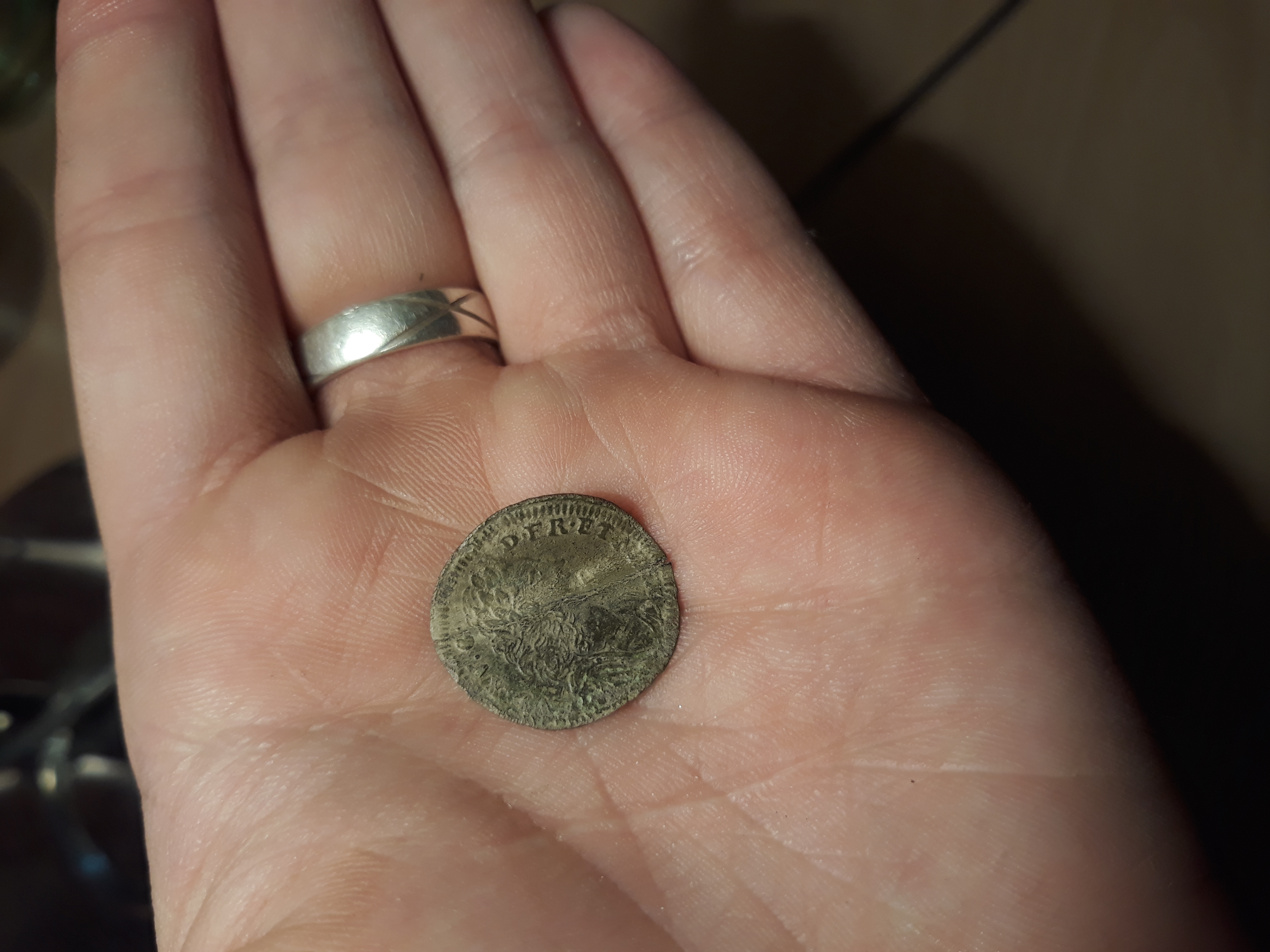 diese kleine Münze mit der Größe eines 20 C Stück war auch dabei. Vorderseite ein Kopf eines Mannes mit Umschrift. Rückseite komplett blank. Die Münze war komplett zusammen gedrückt in der Mitte deshalb eine Seite relativ gut erhalten. Material ist Kupfer. Jemand eine Idee?