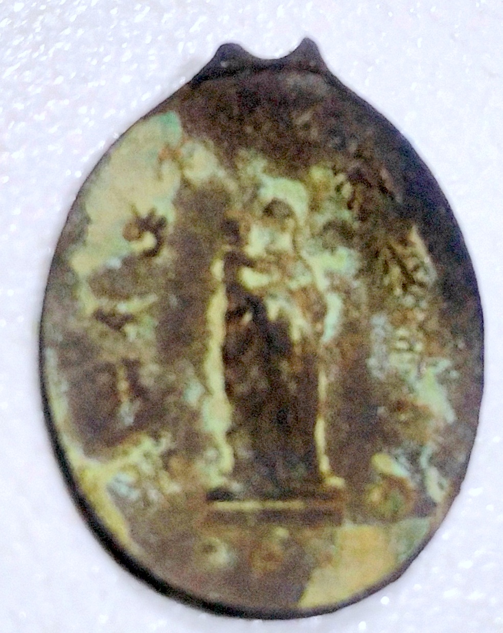 Es ist wohl ein Heiligenanhänger, ziemlich philigran, ein Mann mit Gewand ist abgebildet und vermutlich hebräische Buchstaben.