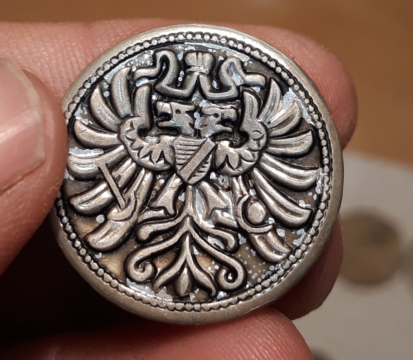 jemand eine Ahnung welcher Doppelkopfadler hier dargestellt wird? Österreich oder etwas anderes? Der Knopf ist zwar aus Alu, aber ich finde ihn trotzdem sehr schön.