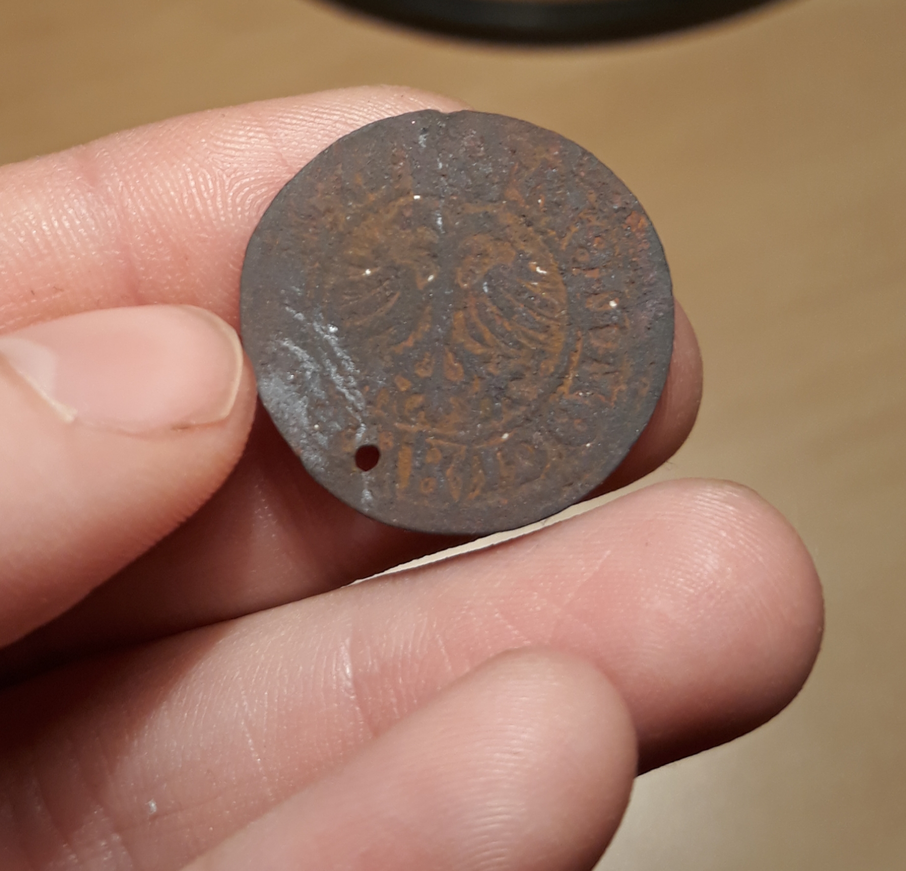 Wieder mal etwas, dass wir nicht zuordnen können. Eine Seite Doppelkopfadler, auf der anderen ein Wappen. Fundgebiet: Niederbayern. Material: Kupfer, scheint vergoldet gewesen zu sein. Entwertet. Durchmesser etwa 2 cm.