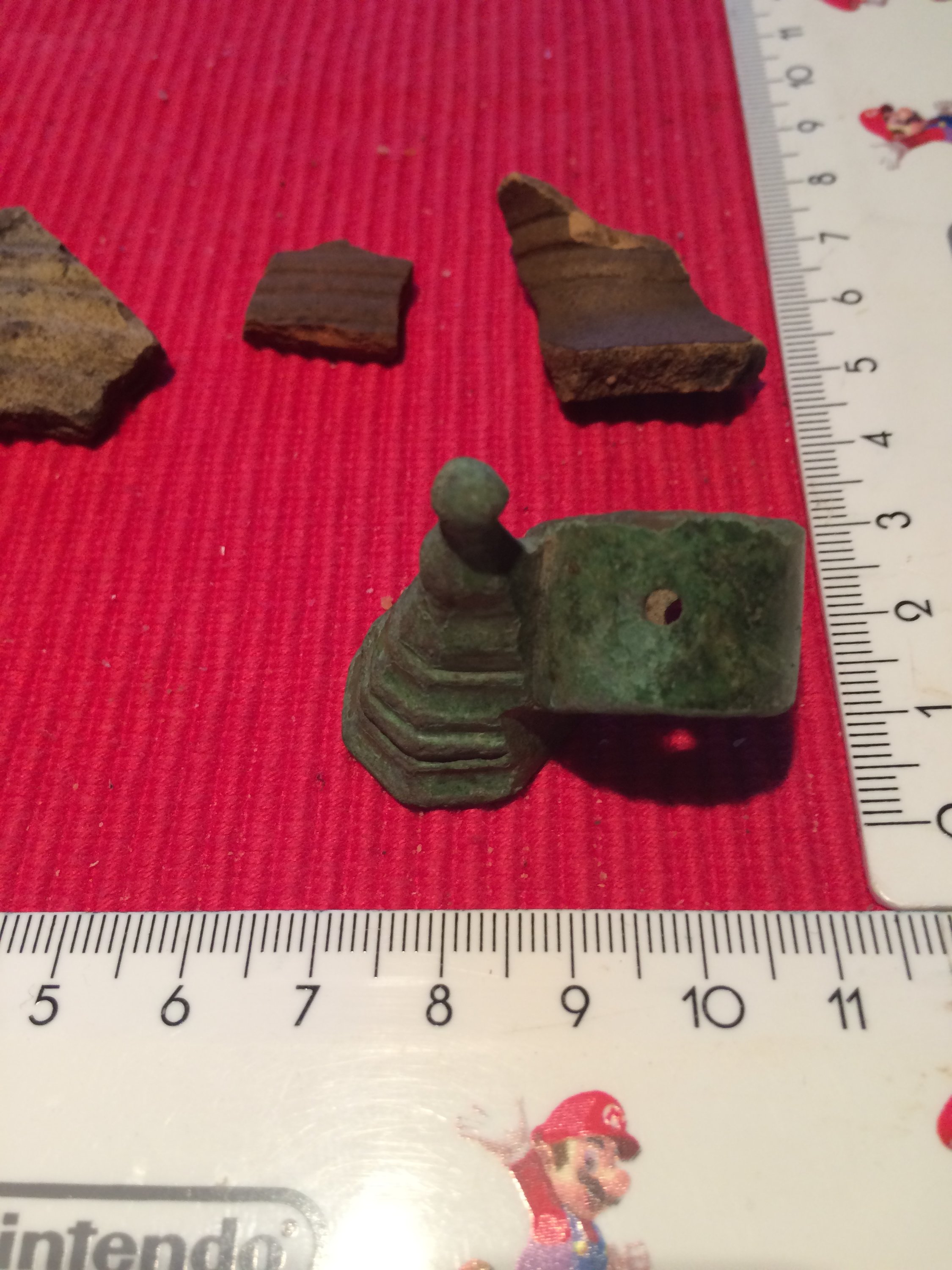 Gestern im stroemenden Regen unterwegs gewesen, bis auf dieses Teil hier absolute Null Runde. Ich habe dieses Objekt im Wald an einer abgegangenen Burg gefunden. Der Ring ist fest mit dem pyramidenfoermigen Stueck verbunden, ja es scheint als sei es aus einem Stueck gefertigt. Der Ring ist konisch geformt. Der Ringinnendurchmesser ist auf der breiten Seite 1,7 cm und auf der schmalen 1,5 cm.In dem pyramidenfoermigen Stueck befindet sich eine Bohrung. Die Bohrung hat einen Durchmesser von 7 mm und ja der Winkel zwischen "Halterung" und "Pyramide" ist merkwuerdig. Am Boden der "Pyramide" sind 5 kleine Loecher.