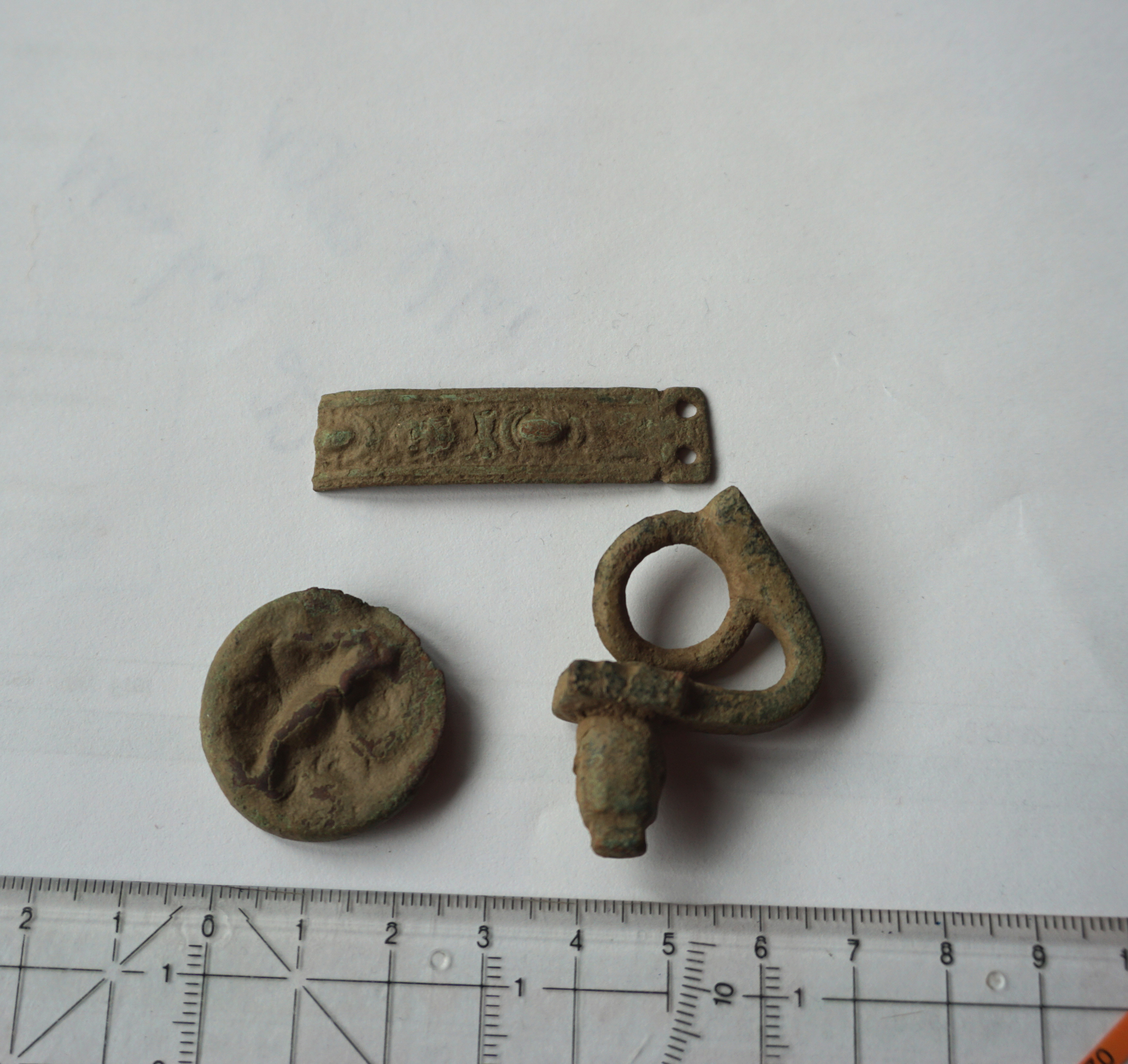 habe hier ein paar Funde aus dem letzten Jahr, die ich nicht wirklich bestimmen kann. Ich vermute, dass es sich um Objekte aus der Römerzeit handelt, könnte allerdings natürlich auch neuer sein. Hat jemand von Euch eine Idee, worum es sich handelt? Bei dem runden Objekt hatte ich an eine Art Scheibenfibel gedacht, allerdings könnte es sich auch um einen verformten Knopf handeln. Vielleicht kann mir ja einer von Euch helfen und mir sagen, ob ich falschliege :D .