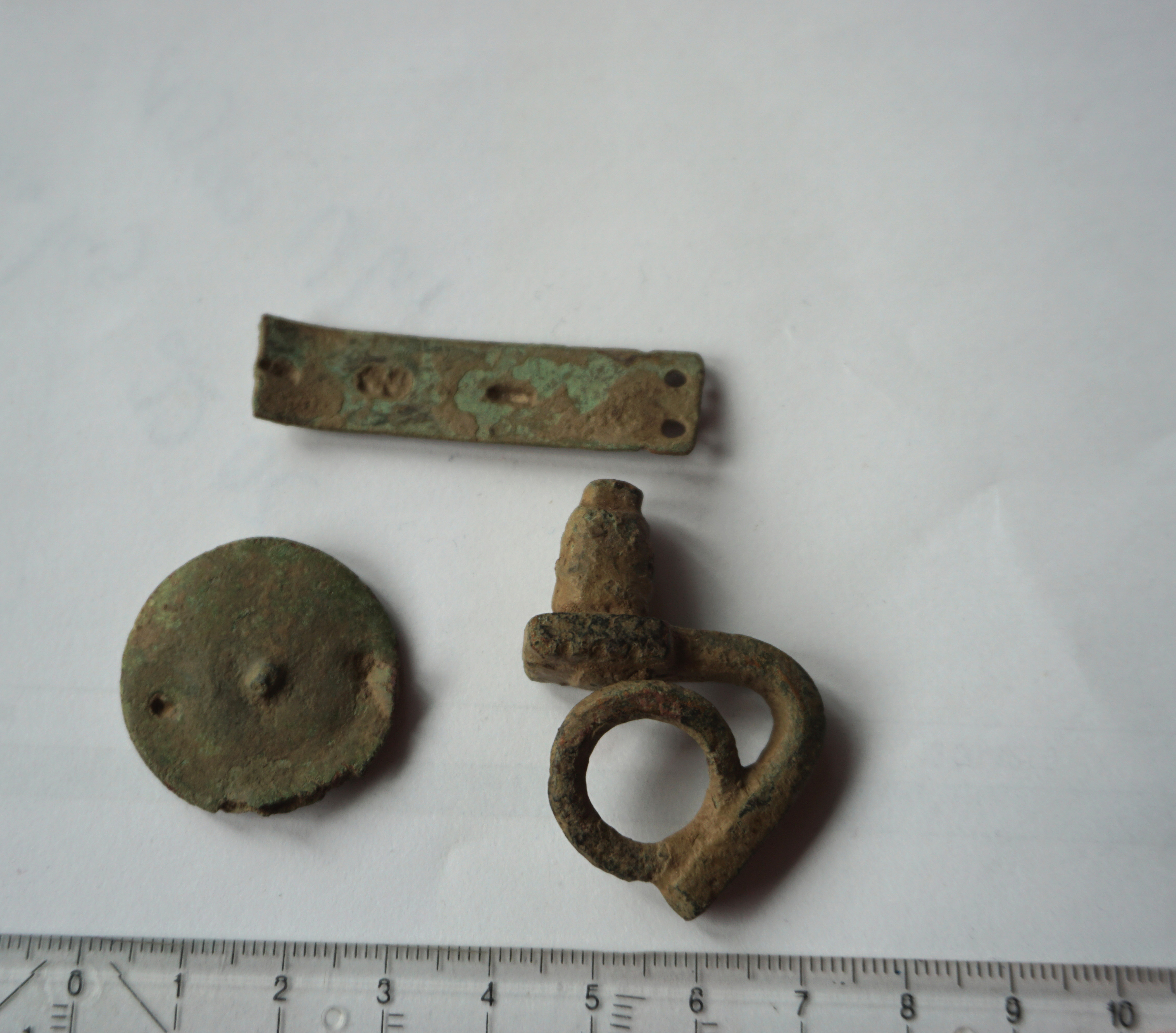 @ Latricia: Die Funde sind alle aus Kupfer und Emaillereste sind an der "Fibel" keine zu erkennen. Was mich so ein bisschen in die Richtung Fibel hat denken lassen, sind die spiralförmigen Verzierungen. Habe aber mittlerweile gelesen, dass das auch im Mittelalter weit verbreitet war. Habe noch mal versucht, bessere Fotos zu machen.